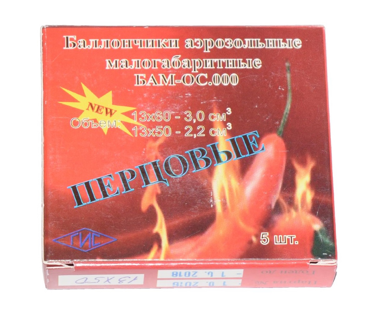 Баллончики аэрозольные малогабаритные перцовые 13×50 (БАМ.ОС) предназначены для прицельного метания жидкости в лицо биообъекта из устройств аэрозольного распыления типа «Удар», «Бамер», «Чародей» с целью временного подавления агрессивных действий нападающего. Действующее вещество — олеорезин капсикум (экстракт красного перца). БАМы выпускаются длиной 50 и 60 мм. Корпус БАМа выполнен из полимерного материала.