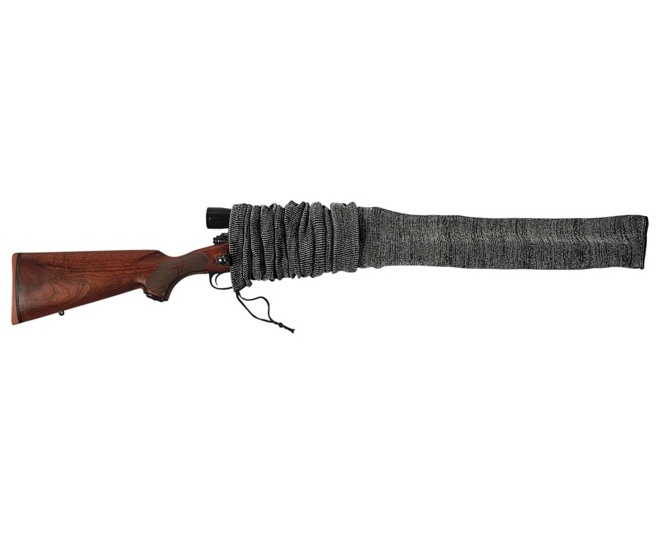 Мягкий чехол серого цвета для оружия с оптическим прицелом, в том числе для высоких прицелов. Чехол изготовлен из трикотажной ткани с добавлением силикона. Силикон в составе ткани служит для предохранения оружия от загрязнений, ржавчины, царапин и механического воздействия. Чехол-чулок не защищает от влаги, но и не препятствует ее испарению. Затягивается с помощью шнурка.