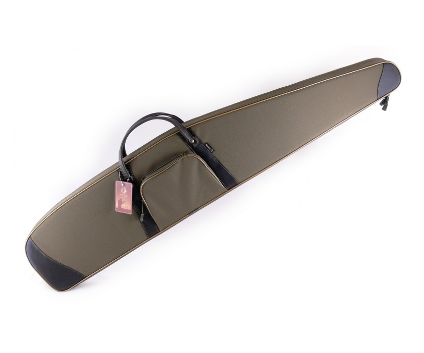 Чехол из синтетической ткани с кожаной отделкой, рекомендован для хранения и транспортировки винтовки с оптическим прицелом. Материал использован плотный и износоустойчивый. Детали отделки из кожи: ручки для переноски и накладки на краях чехла. С одной стороны находится регулируемый ремень, который позволяет переносить чехол не только за ручки в горизонтальном положении, но и на одном плече вертикально. Чехол содержит поролон и подкладку из мягкого флока, которые защищают оружие от царапин и других механических повреждений. Закрывается основное отделение на молнию с двумя замками. Снаружи есть карман для полезных мелочей, который закрывается на молнию с одним замком. Также на чехле имеется специальная петля, которую удобно использовать при хранении чехла, подвешивая его. Длина внешняя 135 см, внутренняя 130 см.