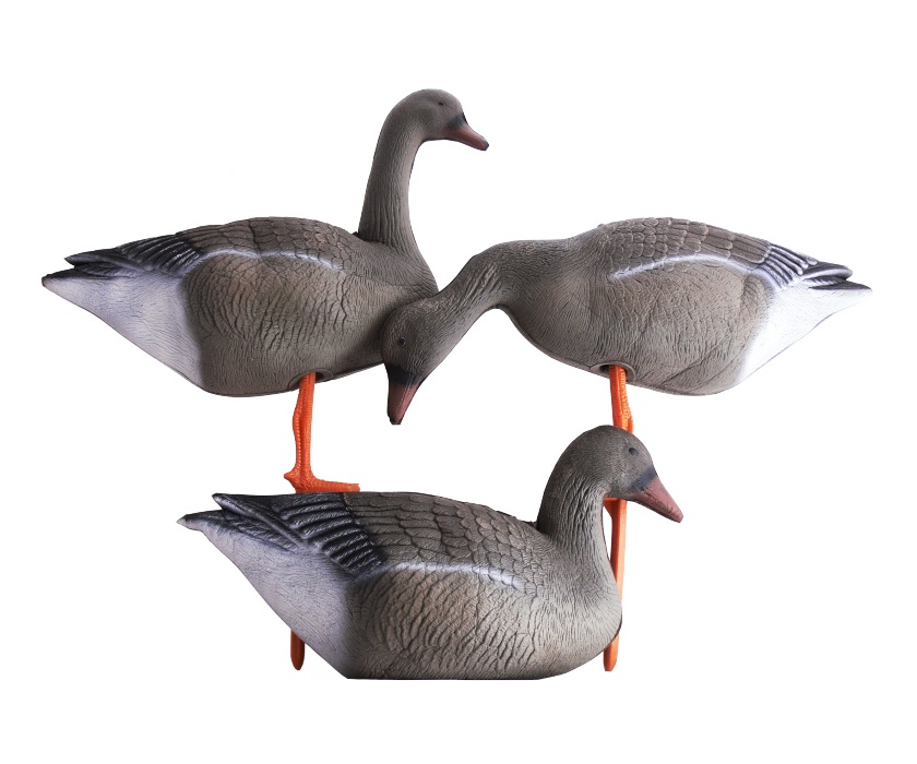 В комплекте с каждым чучелом — прочная оранжевая лапа-стойка из пластика. Чучела полнообъёмные, очень легкие, легко сминаются для транспортировки, быстро собираются, не бликуют, занимают мало места в упакованном виде. В разобранном виде принимают размеры сопоставимые с размером живого гуся. Пластиковая лапа-стойка идет в комплекте с гусем.