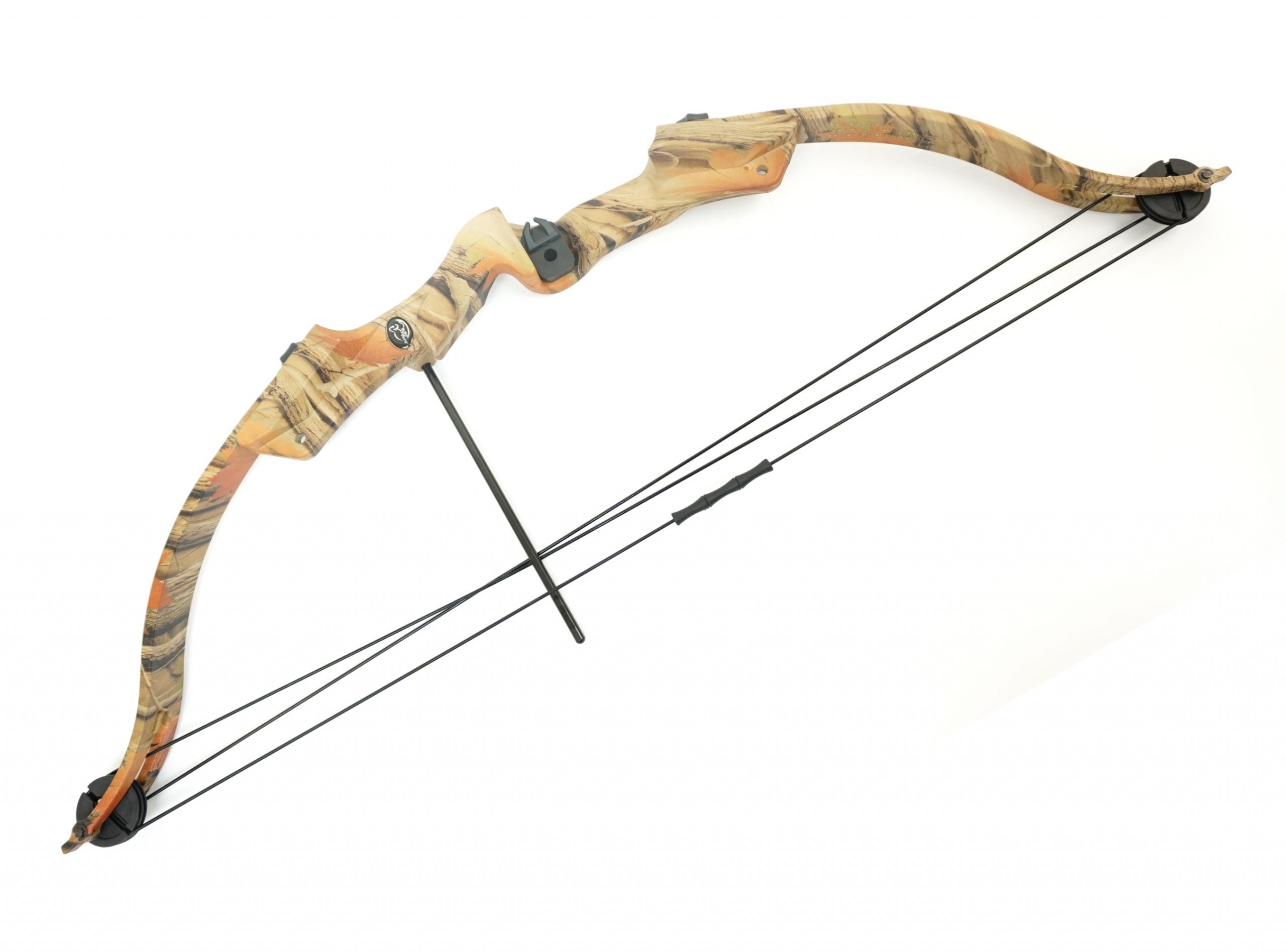 Рукоятка лука изготовлена из качественного полимера, тетива выполнена с использованием кевлара, долговечного и надежного синтетического материала. Рукоятка имеет камуфляжную окраску, что особенно нравится детям и подросткам. Изделие компактно – длина его 79 см, весит всего 0,8 кг. Комплектация включает пару фиберглассовых стрел, кивер, напальчник и крагу.