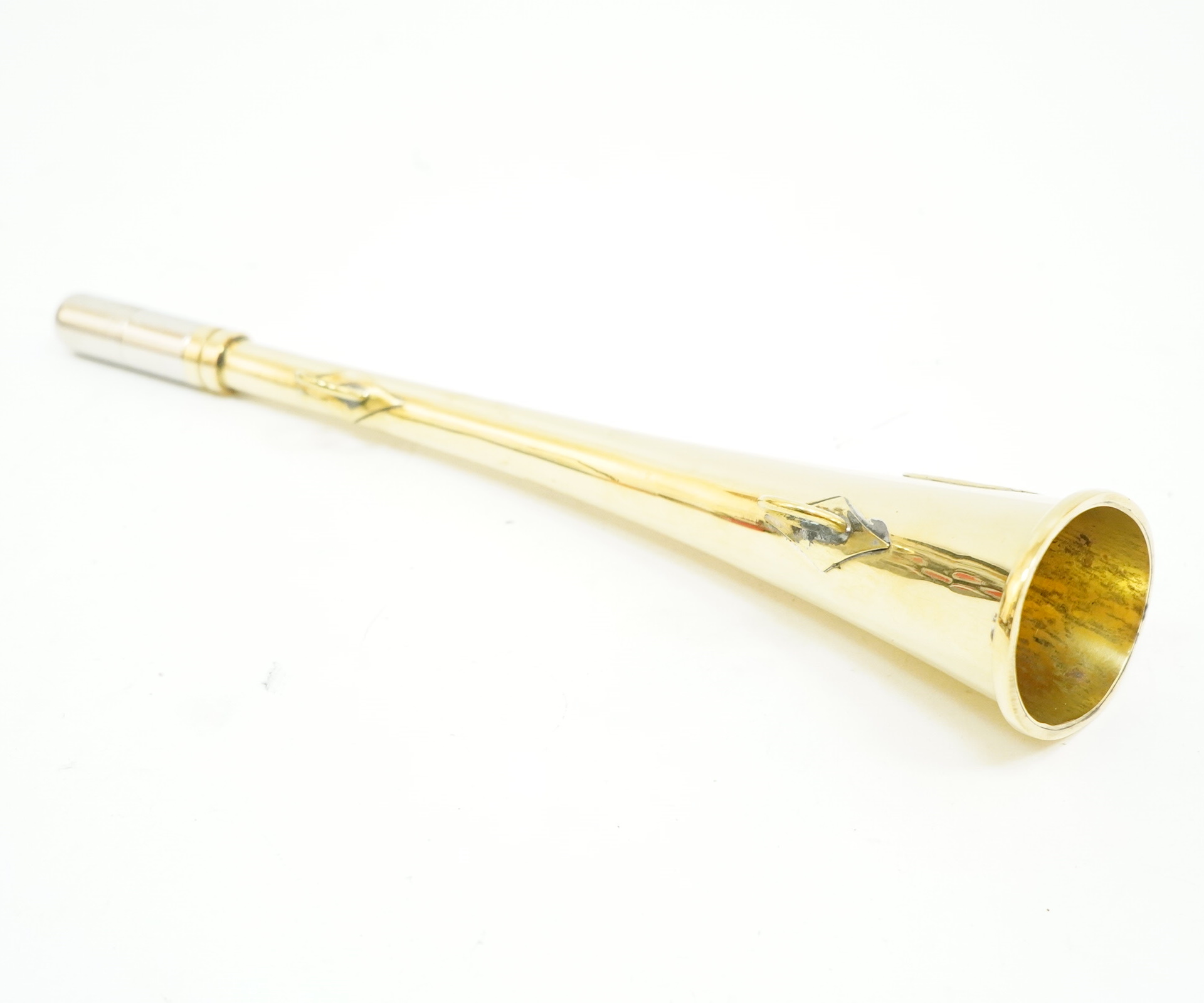 Горн длиной 25 см из латуни с пищиком предназначен для подзыва охотничьей собаки. Встроенный пищик освобождает от необходимости учиться правильно извлекать звук. Каждый охотничий рог имеет индивидуальный тон. На горне есть эмблема в виде головы кабана.