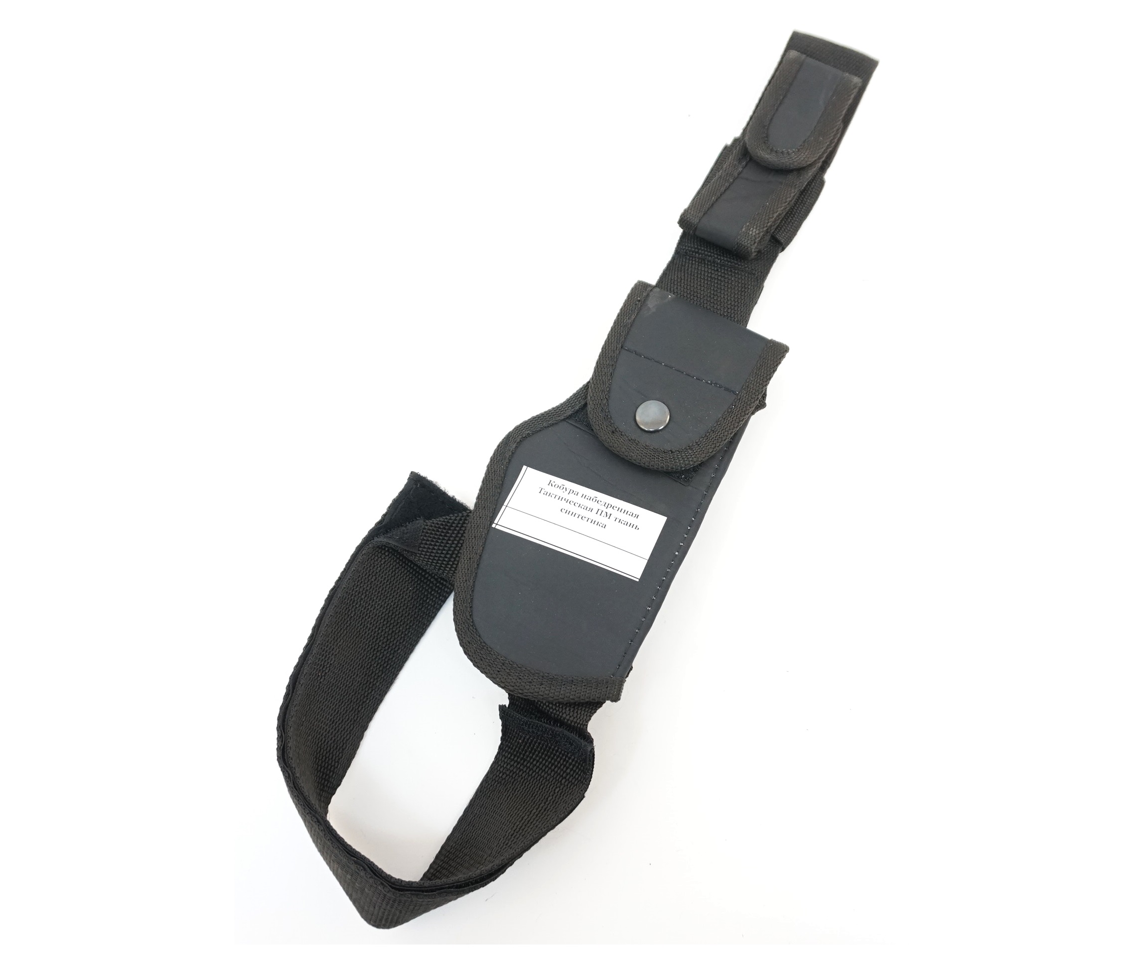 Кобура, изготовленная для ношения пистолета Макарова, выполнена из синтетической ткани. Она носится на бедре, пристегнутая надежным креплением, которое обхватывает ногу. Помещенный внутрь пистолет, застегивающийся на ремешок с кнопкой, располагается вертикально.