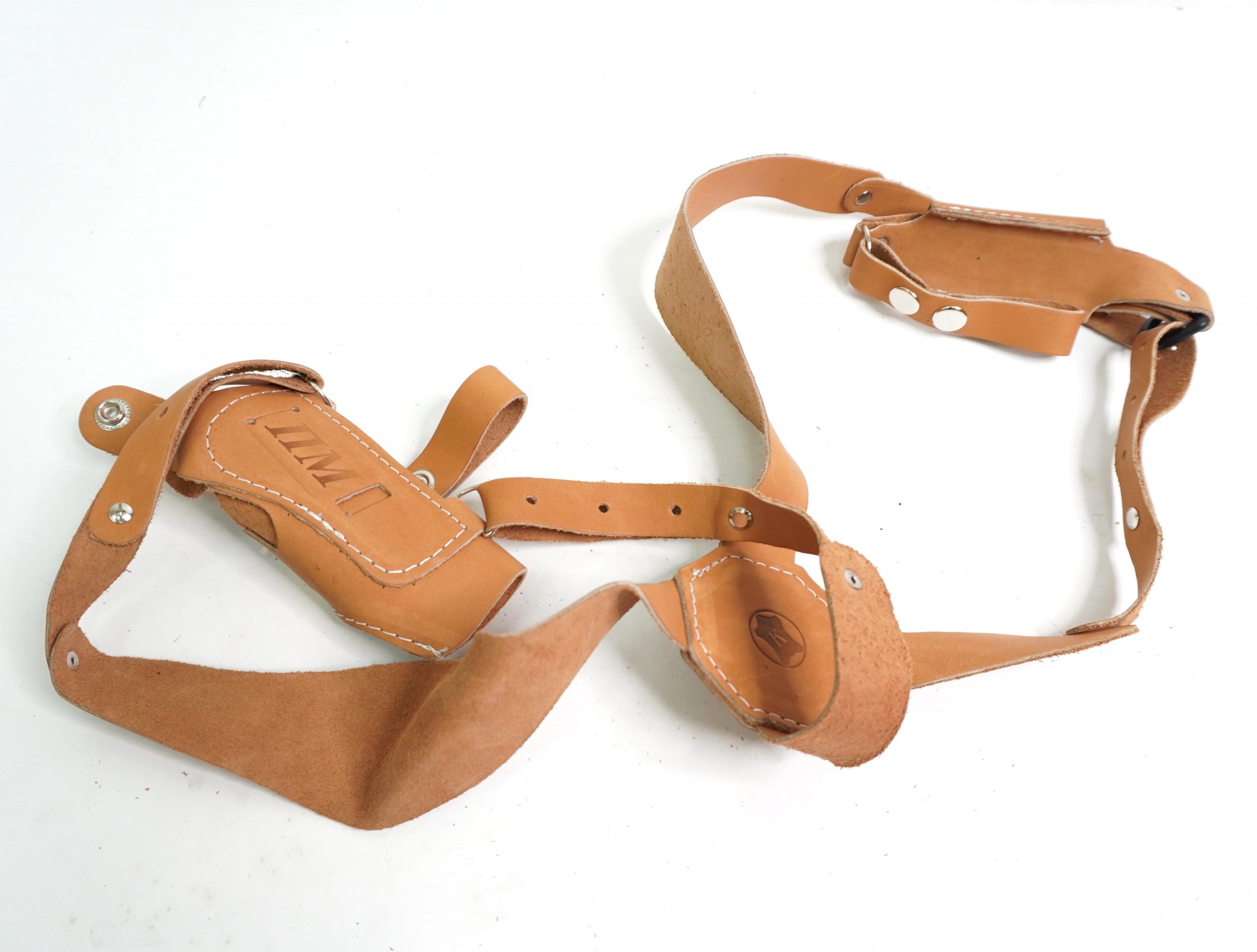 Кобура оперативная (скрытого ношения) для ПМ (пистолет Макарова) X-образная из натуральной кожи юфть с карманом для второго запасного магазина. Имеет регулируемые ремни, пистолет и карман под обойму фиксируется застежкой-кнопкой. Коричневая.