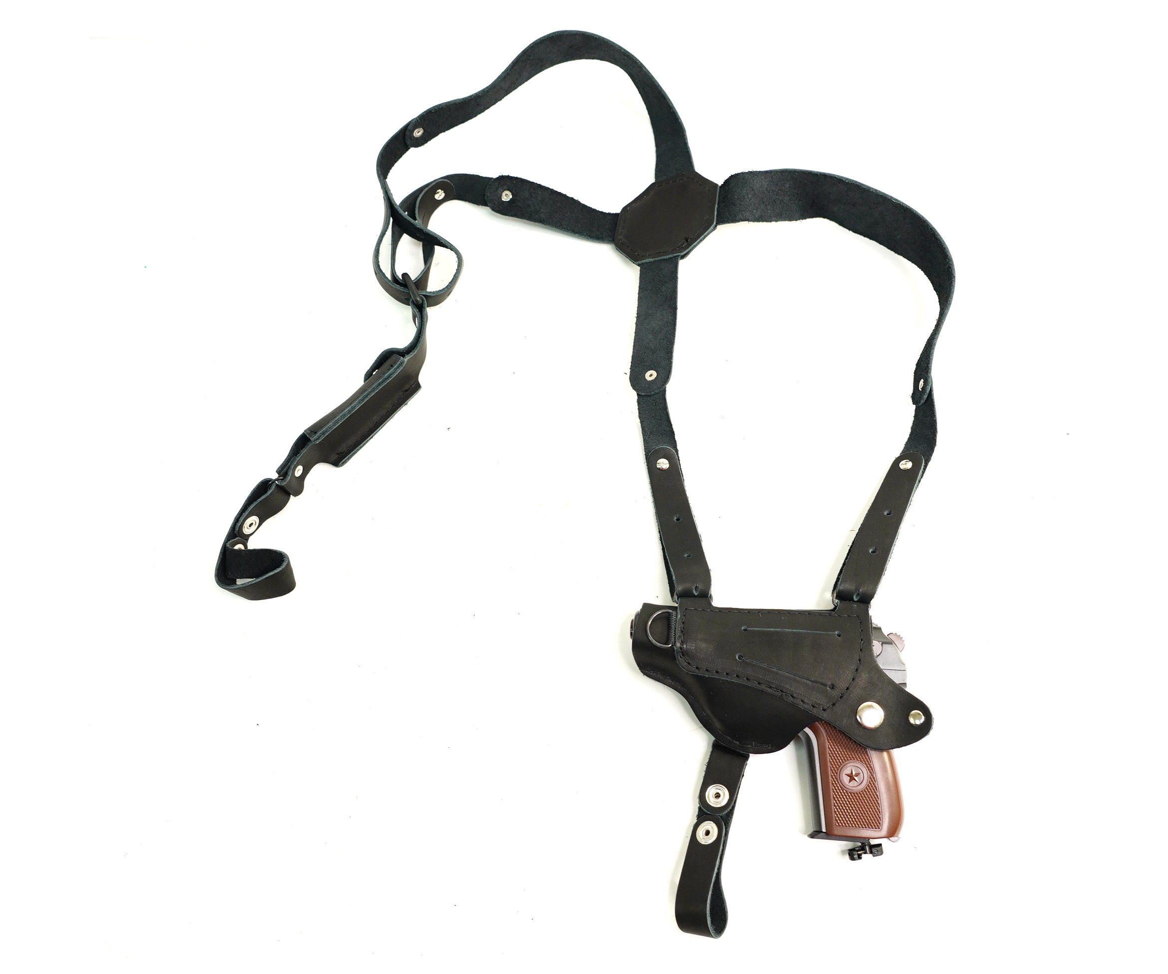 Кобура оперативная (скрытого ношения) для ПМ (пистолет Макарова) X-образная из натуральной кожи с карманом для второго запасного магазина. Имеет регулируемые ремни, пистолет и карман под обойму фиксируется застежкой-кнопкой. Крепление на ремень с помощью клипсы.