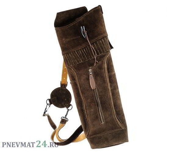 Большой колчан для арбалетных стрел из натуральной замшевой кожи коричневого цвета с застежкой из буйволиного рога и удобным карманом на молнии.