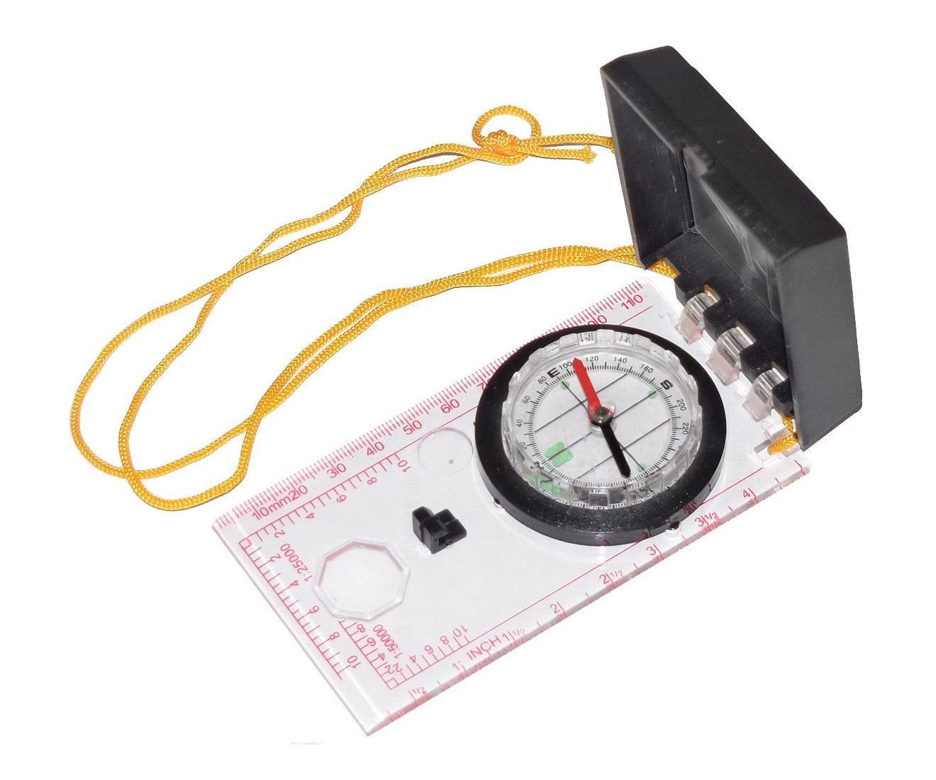 Компас для работы с картами, изготовленный в Китае. Модель оснащена крышкой, под которой находится зеркало. Корпус устройства выполнен в виде пластиковой линейки. Кроме того, компас поставляется с нейлоновым шнурком, который упрощает процесс транспортировки модели.