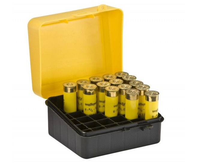 Коробка для патронов фирмы Plano — это прямоугольный футляр из ударопрочного пластика для хранения патронов с индивидуальными ячейками вместимостью до 25 патронов 20 калибра длиной до 76 мм. Изделие выполнено в черном цвете, удобная прозрачная откидная желтая крышка. На коробке ушки для наружного замка. Внутри бокса есть отделение для мелких предметов. Отлично подходит для использования и транспортировки, как на охоте, так и для длительного хранения патронов. Она защищает боеприпасы от ударов, влаги и пыли, а также повышает вероятность сохранности при резких перепадах температур.