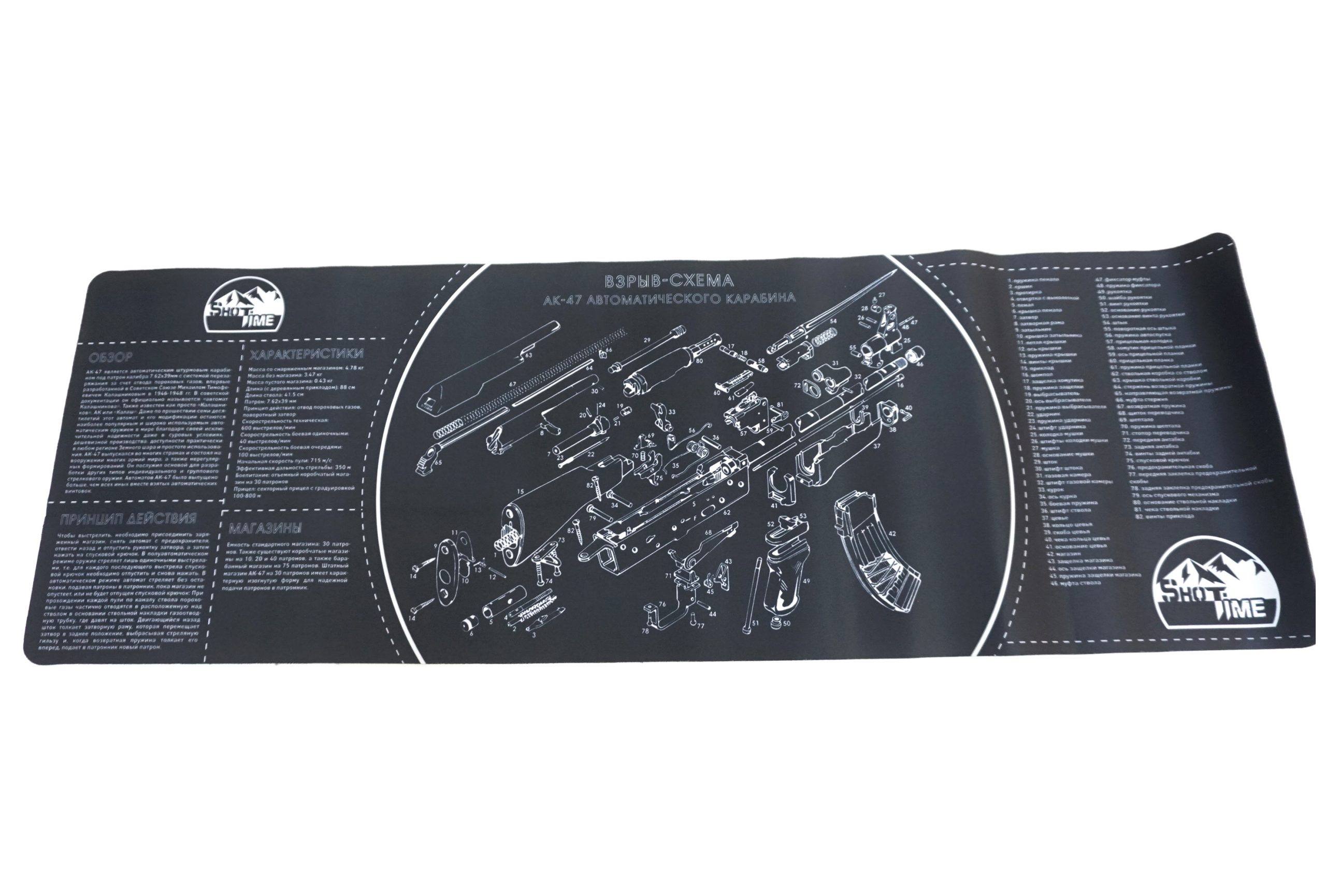 Коврик для чистки оружия представляет собой прямоугольник из прорезиненного материала размером 90×30 см, с фактурной нескользящей нижней стороной. На лицевой стороне размещены самые полезные и важные сведения о легендарном карабине АК-47, автомате Калашникова. В производстве использованы высокотехнологичные и безопасные материалы, качество производства — на высоком уровне.