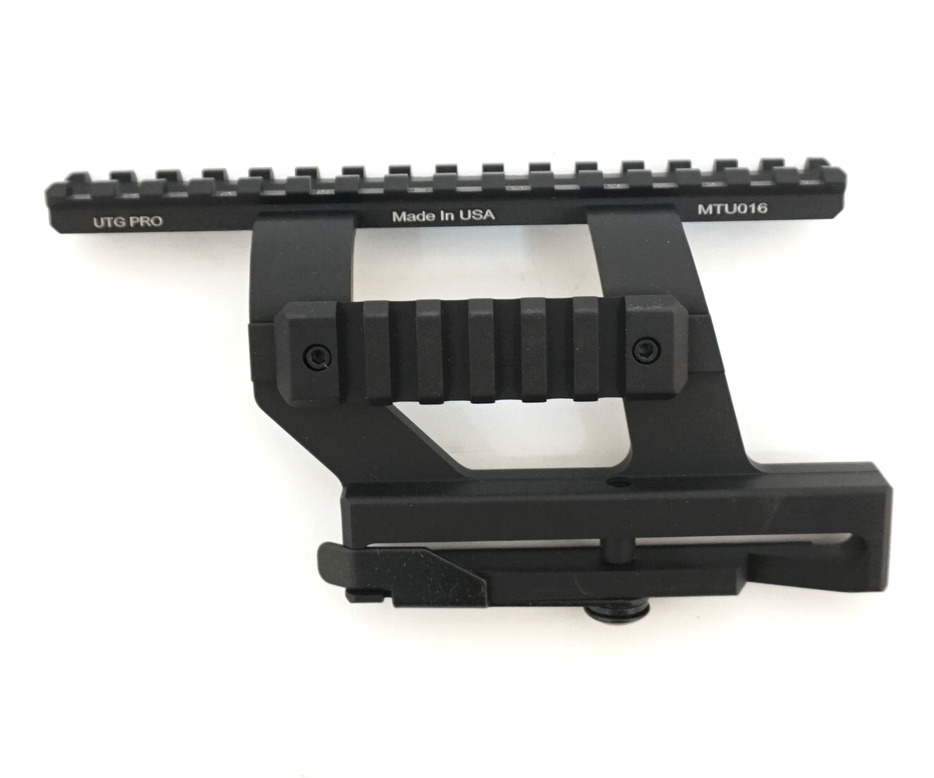 Быстросъёмный кронштейн бокового крепления Leapers UTG PRO MTU016 (U978S) с верхней базой Weaver предназначен для установки коллиматорных, оптических или прицелов ночного видения на оружие на базе автомата Калашникова — Сайга, Вепрь, АК, АКС, АКМ и др. Конструкция крепёжного узла позволяет установить кронштейн Leapers UTG PRO MTU016 и на другое оружие с боковой планкой «ласточкин хвост» 14,2 мм.