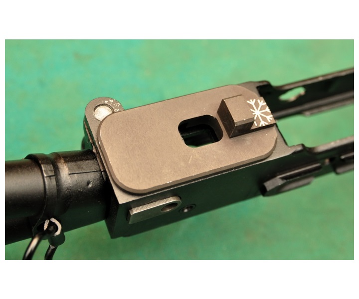 Площадка имеет сложную форму, с высокой точностью изготовлена фрезерованием и зачернена анодирование. Заготовка – болванка из В95. Это деформируемый алюминиевый сплав, содержащий высокий процент цинка и магния. Обозначение буквой «В» обозначает повышенную прочность дюралевого сплава. Цифра 95 — показатель процентной чистоты сплава. Марка В95 с легкостью поддается механической обработке. Обладает высокой твердостью. Данный алюминиевый сплав применяют при изготовлении высоконагруженных конструкций. Поэтому В95 и получил столь широкое распространение в оружейном деле.