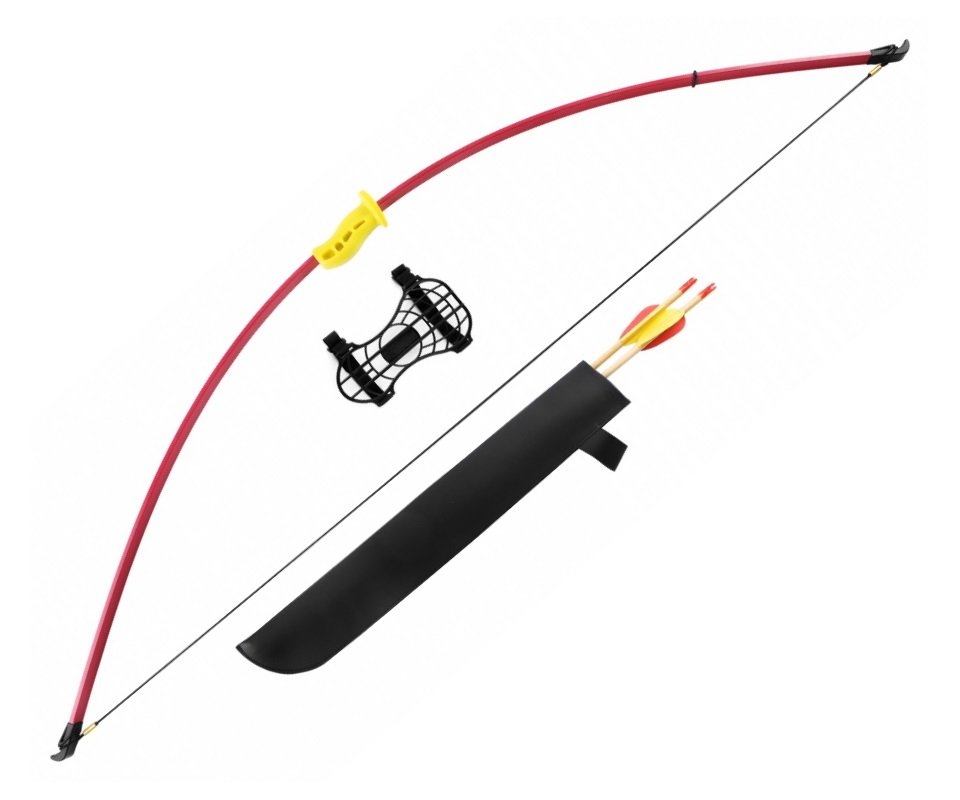 Основной материал изготовления этого детского лука – фибергласс, упругий и прочный полимер. Тетива изготовлена из синтетической нити. Цвет исполнения – желто-красный. Изделие имеет длину 130 см, вес 0,9 кг и отличается широкой комплектацией, позволяющей сразу получить все необходимое для стрельбы – защитная крага, колчан для стрел, две деревянной стрелы, а также бумажная мишень и напальчник.