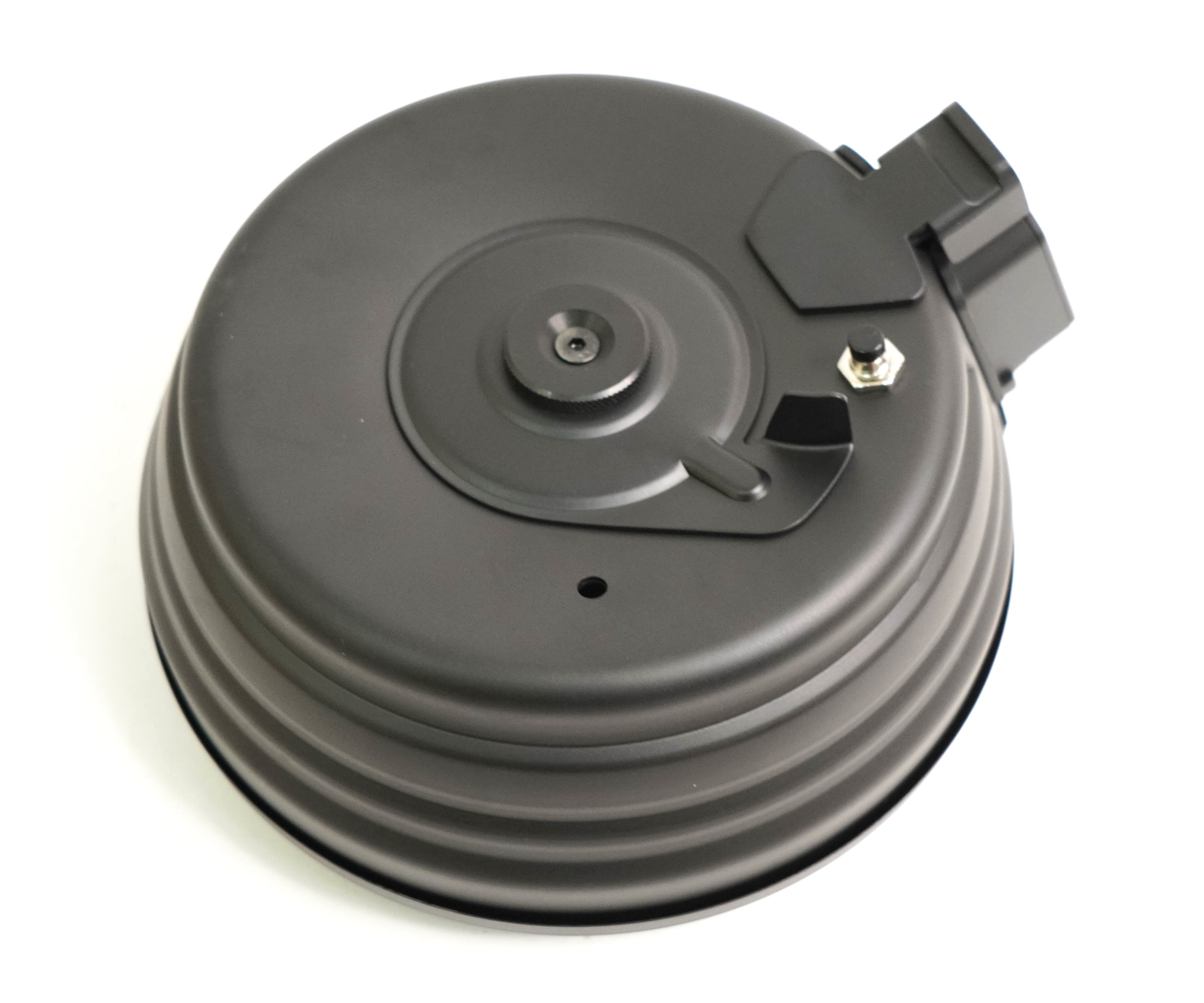 Магазин электрический C38 АК от компании CYMA. Модель – бубен, форма – усеченный конус. Имеет также металлический корпус вместимостью 2800 шаров. Рассчитан на применение на пулеметных приводах АК-серии. Магазин массой 770 граммов изготовлен из металла, окрашенного в черный цвет. Работает от электрических батареек.