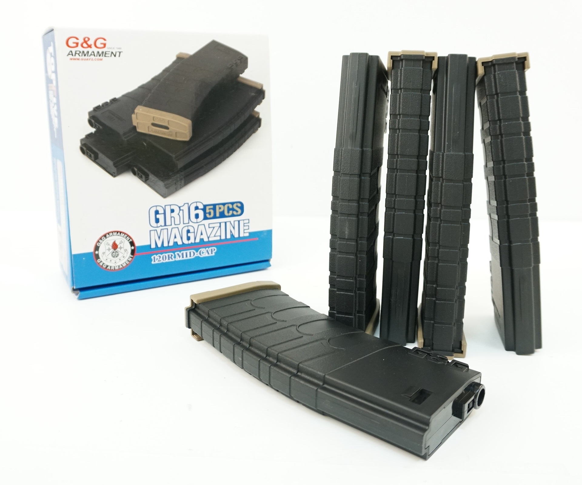 Магазин механический (5 штук) G-08-126 от компании G&G, Тайвань. Вместимость – 120 шаров. Магазин подходит для страйкбольных приводов серии M4-M16. Корпус изготовлен из пластика черного и песочного цветов.