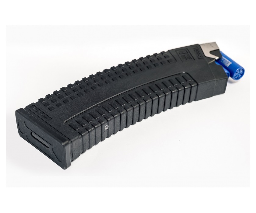 Отличием от базовой модели магазина Вепрь-12 являются рёбра жёсткости и заклёпки, что способствуют надёжному удержанию скобы. Кроме шероховатой поверхности, внешние стенки покрыты рисунком-протектором, не дающим магазину скользить в руках. Магазин легко разобрать. Утопив кнопку фиксатора тыльной крышки, вы можете легко снять ее и получить доступ для чистки и обслуживания.