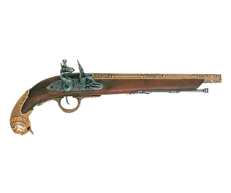 Макет пистолет кремниевый, латунь – это полноценная копия оружия, которое изготавливали немецкие оружейники в 18 веке. В этот период кремниевое оружие было самым распространенным, и вытеснило фитильные и колесцовые модификации. К началу 18 столетия в Германии кремниевое оружие использовалось и как охотничье, и в качестве дуэльного, а также как оружие регулярной армии. Пистолеты с ударно-кремниевыми замками стали надежнее и прочнее, калибр боеприпасов со временем уменьшился, ружья и пистоли имели идеально выверенную форму и размеры, отличались хорошей для того времени мощностью боевой пружины. Главным недостатком кремниевых пистолетов были частые осечки, так как кремний и огниво имели свойство быстро изнашиваться, ствол закупоривался нагаром. Шомпол был неотъемлемой частью кремниевого оружия. Кроме того, проблемой кремниевого оружия была низкая скорострельность, так как заряжание оружия было процессом довольно длительным.