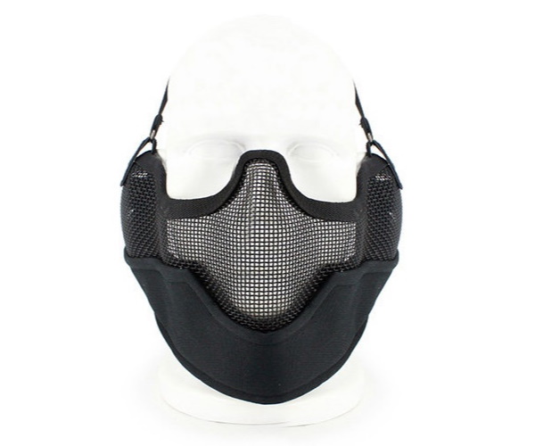 Облегчённая защитная маска изготовлена из жестяной сетки, что позволяет надежно защищать от травм нижнюю часть лица, нос и уши.