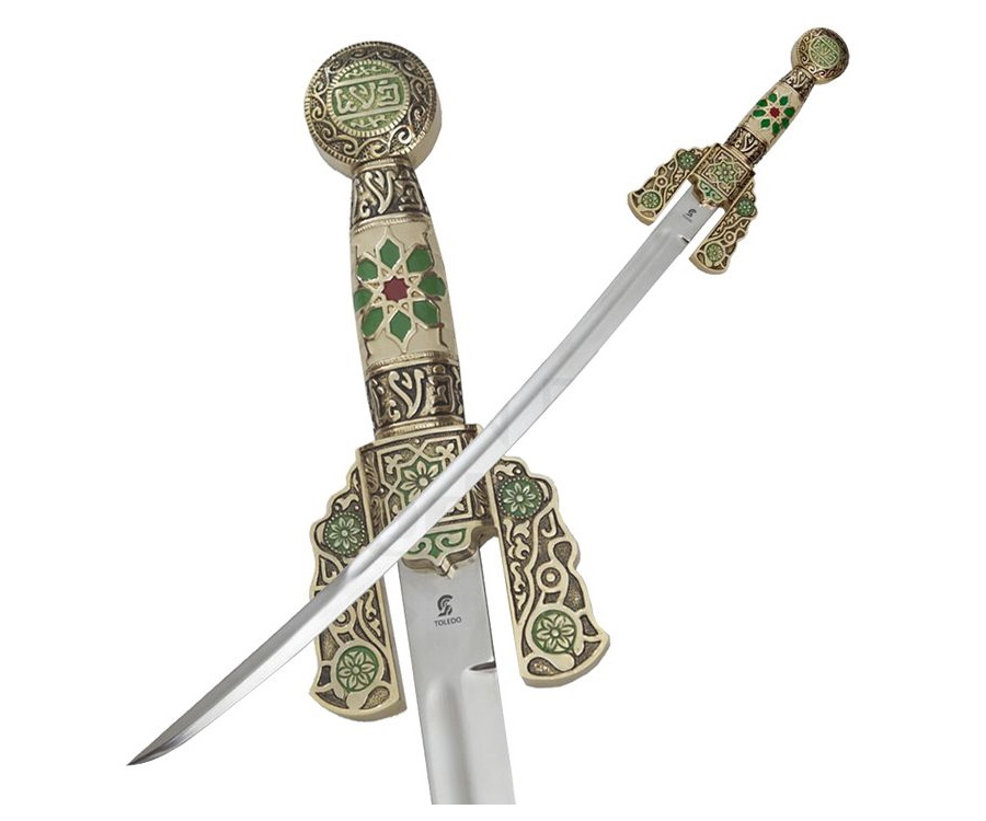 Яркий и экзотический меч Арабский (Arabic/Arabian Sword) с изысканной отделкой рукояти с гравировками в арабских мотивах. Лезвие изготовлено из нержавеющей стали. Меч имеет тупое лезвие и изготовлен для реконструкторов и для украшения и декора оружейных комнат.