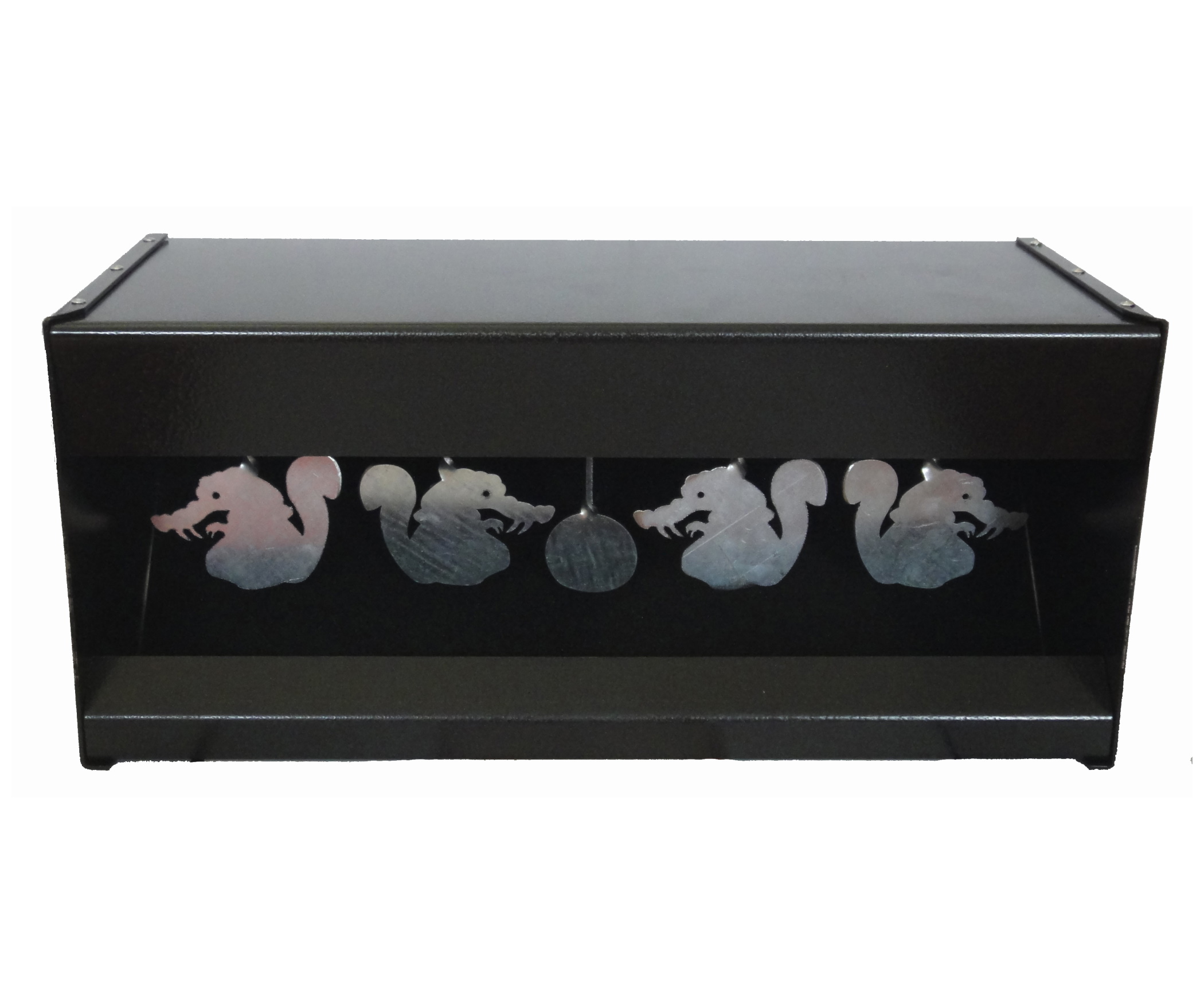 Мишень-минитир «Белки» представляет собой набор из четырех металлических медальонов, встроенных в корпус пулеулавливателя, с механизмом, который обеспечивает дистанционный сброс и восстановление исходного положения мишеней.
