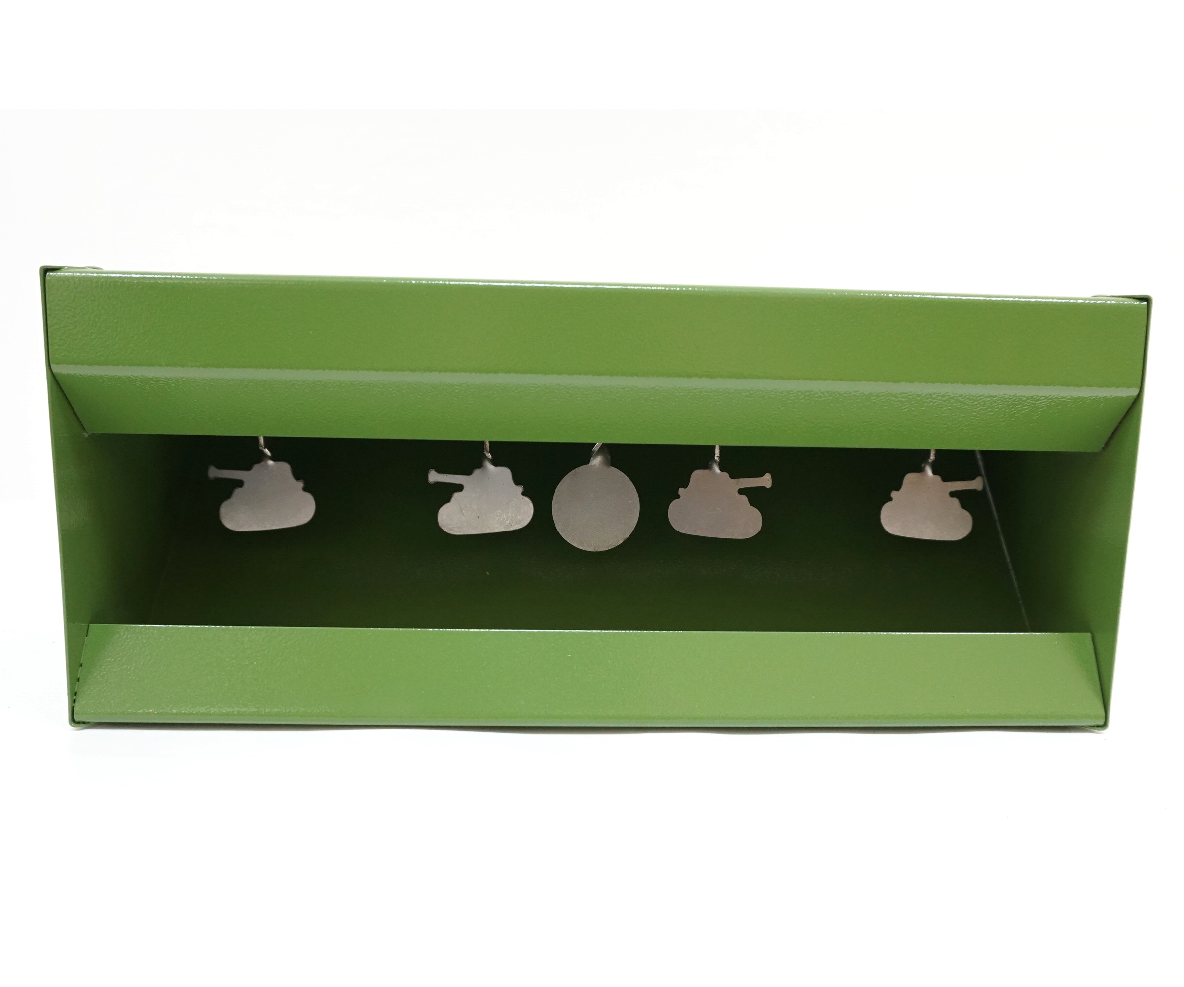 Мишень-минитир «Танки» представляет собой набор из четырех металлических медальонов, встроенных в корпус пулеулавливателя, с механизмом, который обеспечивает дистанционный сброс и восстановление исходного положения мишеней.