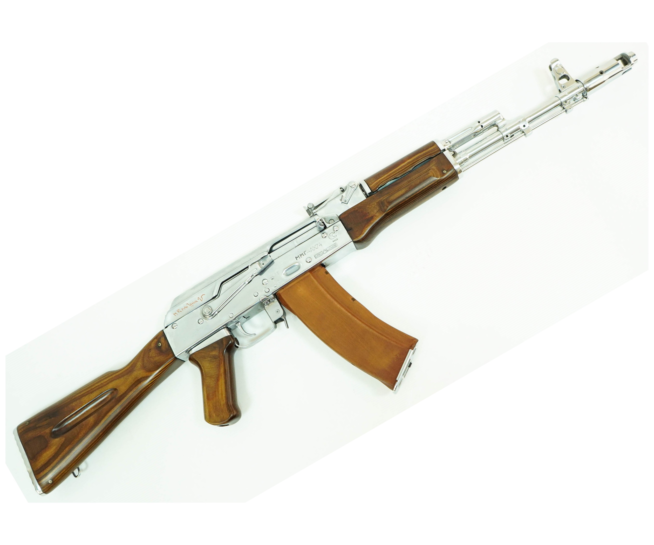 ММГ учебный автомат Калашникова АК-74 (хромированный, дерево) – это модификация на основе боевого экземпляра, с максимально сходным экстерьером и аналогичными габаритными параметрами. Естественно, такой автомат будет невозможно использовать для решения огневых задач. Боевым прототипом данной модели является непревзойденный «Калашников» АК-74.