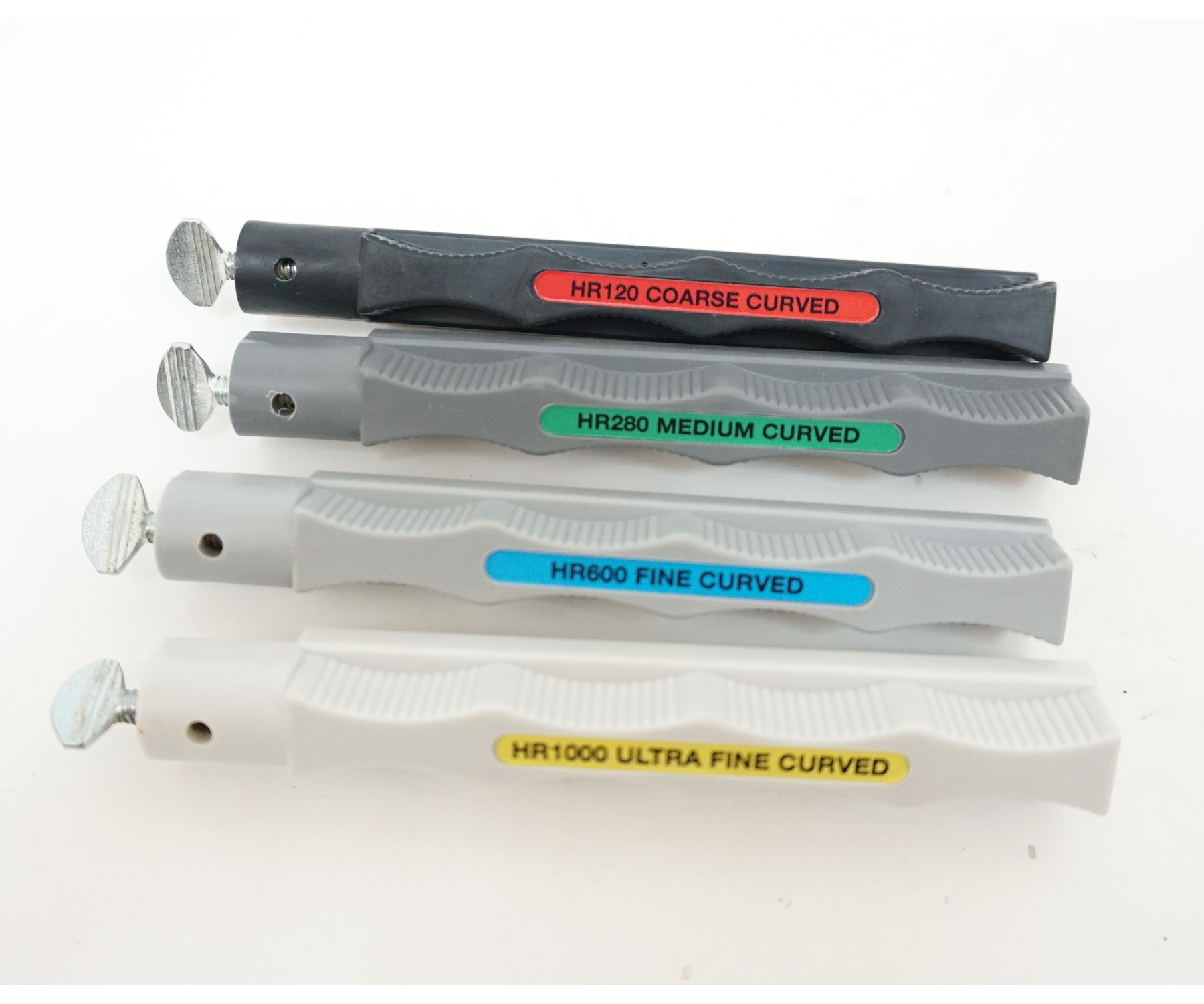 HRSET Curved Blade Hones — это отличный набор брусков, который сделает заточку ножей удовольствием, так как работа будет производиться не только быстро, но и профессионально. Производится этот уникальный набор всемирно известной компанией Lansky из США. В комплекте имеется четыре брусочка для точения, все они имеют округлую форму, при этом отличие состоит в их уровне зернистости. Ими легко можно справиться с заточкой стальных клинков, выправить искривленное лезвие. Особенно часто такие инструменты используют для заточки косы, ножей-кукри, а также керамзита. Чтобы различать брусочки, их специально сделали разными цветами.