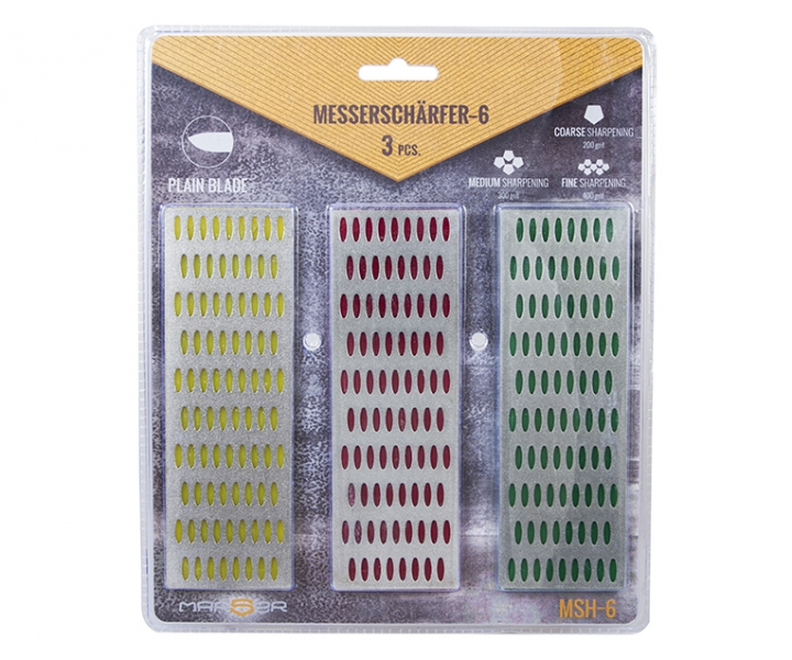 Marser MSH-6 — это набор из трёх алмазных камней предназначен для заточки ножей, ножниц, напильников, деревообрабатывающих инструментов и прочего. Для правки и грубой заточки — применяется камень с зернистостью 200 grit. Для более тонкой заточки клинка используйте камень 300 grit. Для финишной доводки применяется камень на 400 grit.