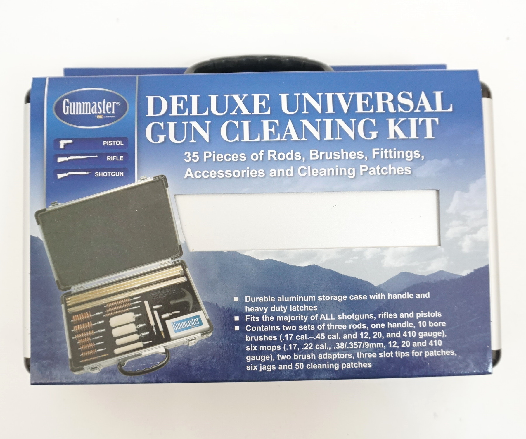 Универсальный набор для чистки оружия в прочном подарочном кейсе из алюминия подходит практически для всех калибров ружей, карабинов и пистолетов.