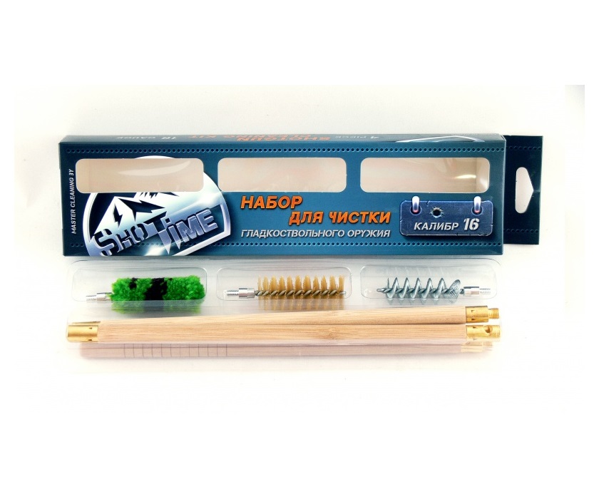 Набор для чистки ShotTime для гладкоствольного оружия 16 калибра, составной шомпол (3 колена) + 3 ерша (пуховка, спираль, щетина). Набор имеет компактные размеры, что позволяет использовать его с одинаковым успехом не только в домашних условиях, но и «в поле» для решения оперативных задач по чистке либо обслуживанию оружия.