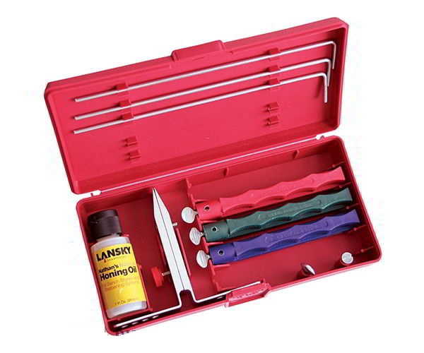 Lansky Standard серии LKC003 — это прекрасный наборчик, который поможет вам с легкостью заточить инструменты. В комплектации находится: зажимная струбцина — 1 штука, 3 бруска, предназначенных для заточки, 3 брусковые направляющие, специальное масло, улучшающее процесс заточки, два дополняющих винта, а также пенал из пластика в котором вс хранится и транспортируется. Главным предназначением такого набора является обеспечение максимально быстрой, качественной и несложной заточки лезвий ножей ,а также бритв. При заточке инструментов используемыми углами будут: 17, 20, 25, 30 градусов.