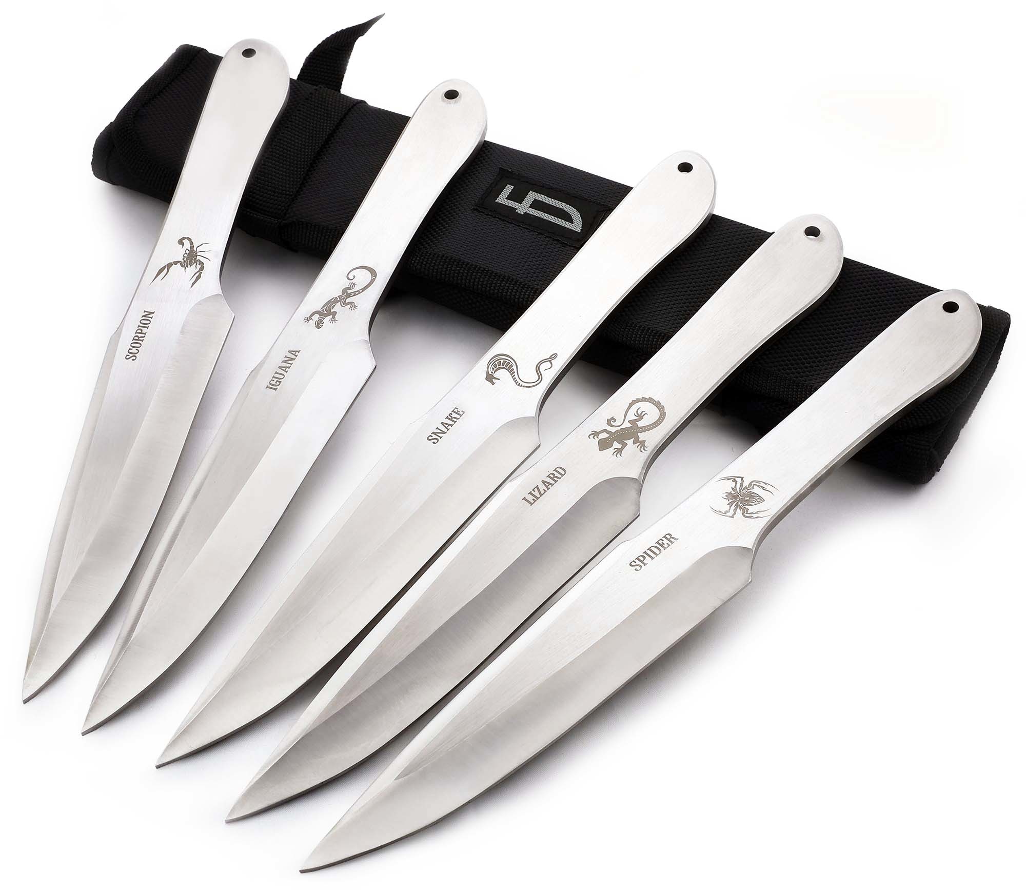 Ножи изготовлены из стали 40Х13, стойкой к сложным внешним условиям и влаге. Режущая кромка ножей набора не имеет заточки. На месте крестовины имеется лазерная гравировка с изображением змеи, игуаны, скорпиона, паука и ящерицы – на каждом ноже гравировка животного индивидуальная. Название каждого животного присутствует чуть выше гравировки. Рукоятка имеет отверстие для закрепления обмотки или страховочной петли.