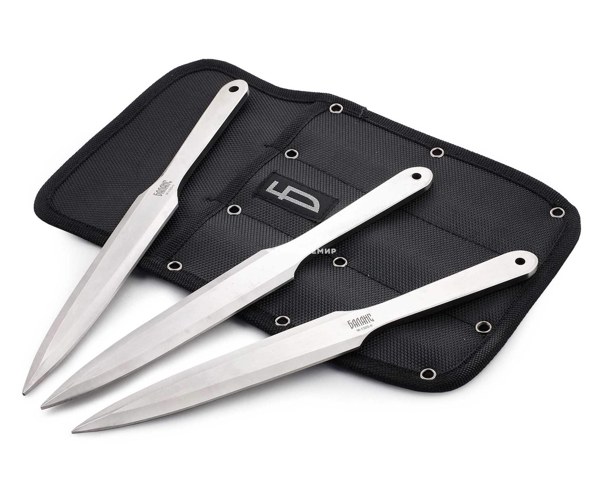 Такое соотношение обеспечивает ножу устойчивость во время полета и вхождение в цель кончиком лезвия. Набор укомплектован ножнами с тремя карманами, швы между которыми усилены стальными заклепками. Товар поставляется в картонной коробке с наименованием серии.