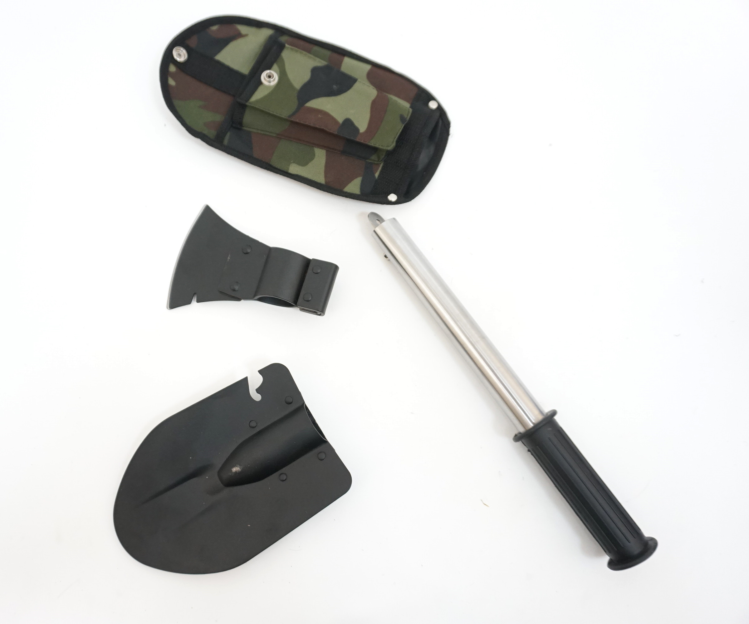 Рукоятка набора металлическая, не боится коррозии и имеет удобную резиновую накладку. Топор и лопата надежно фиксируются на рукоятке. На штыке лопаты дополнительно имеется открывалка для бутылок, банок. Пила и штык-нож спрятаны в полости рукоятки, и всегда будут доступны.