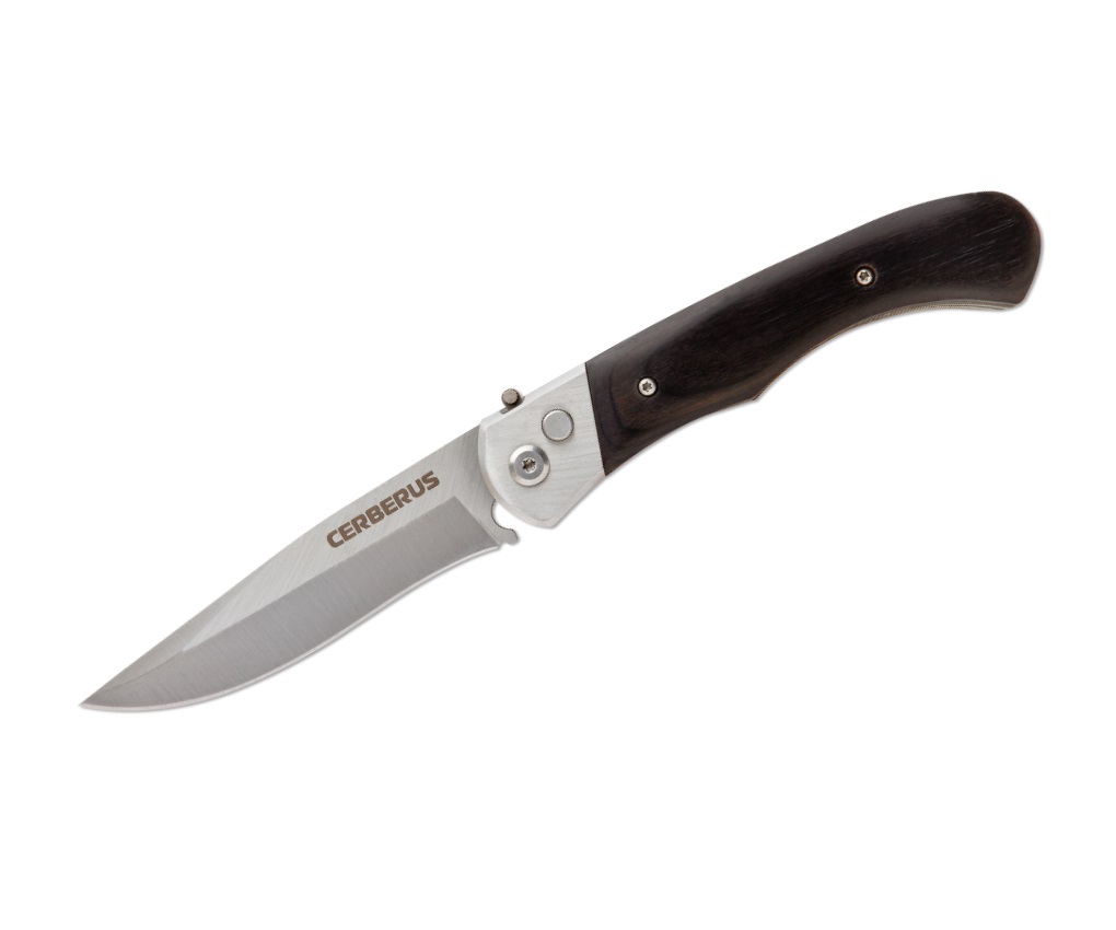 Нож автоматический Чёткий расклад Cerberus A-136 – это изделие с деревянной рукояткой для использования во время походов и в повседневной жизни. Автоматическая конструкция ножа Cerberus A-136 отличается надежностью и долговечностью. Рукоятка имеет удобную эргономичную форму, древесина окрашена в темно-коричневый цвет. Клинок толщиной 2 мм достаточно широкий, ближе к рукоятке имеется надпись модели.