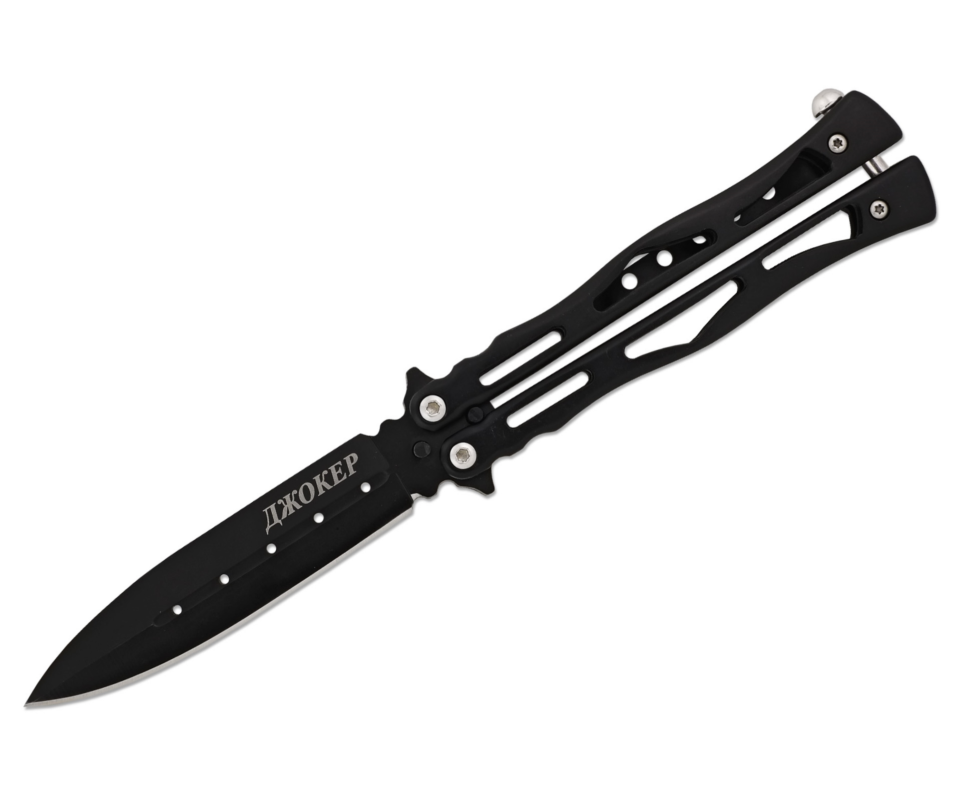 Нож-бабочка Ножемир «Чёткий расклад» Джокер B-116 – это легкий инструмент шарнирно-рамочного типа, представитель легендарных филиппинских ножей балисонг. Такой нож отличает облегченная конструкция, и симметричный узкий клинок формы Drop-Point с острым кончиком. Вес клинка уменьшен за счет дола и сквозных отверстий.