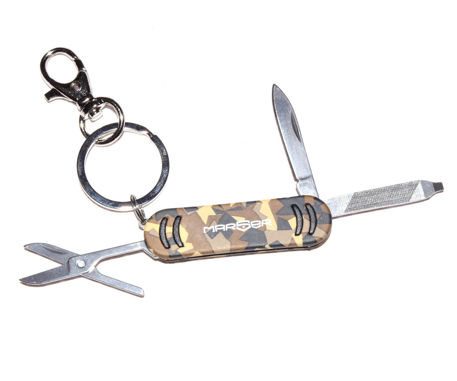 Мультитул Marser с рукоятью «CAMO» расцветки. Набор инструментов включает в себя нож, пилку, ножницы, карабин и кольцо для ключей. Инструменты выполнены из нержавеющей стали. Мультитул Marser Ast-132 выполнен в традиционном форм-факторе ножа-брелока и удобно крепится на ключе, обладая небольшим весом.