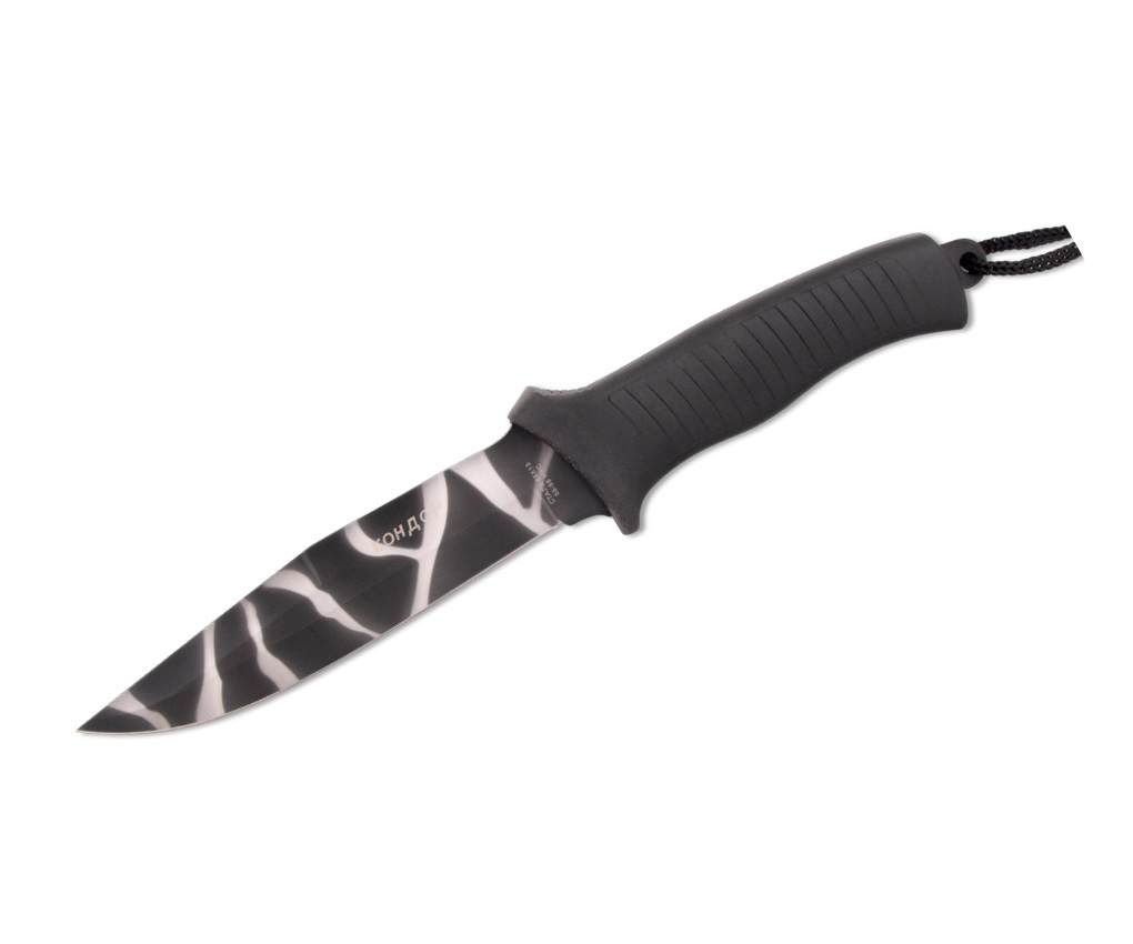 Клинок ножа закален до 55-56 hrc. Клинок в его верхней части имеет плавный спуск, что образует острый кончик. Острие будет всегда оставаться таким же острым, как и в начале эксплуатации. Нож прекрасно держит заточку. Цвет клинка – камуфляж. Имеется антибликовое покрытие. Эргономичной формы рукоятка изготовлена из эластрона – полимерного материала повышенной прочности и стойкости.