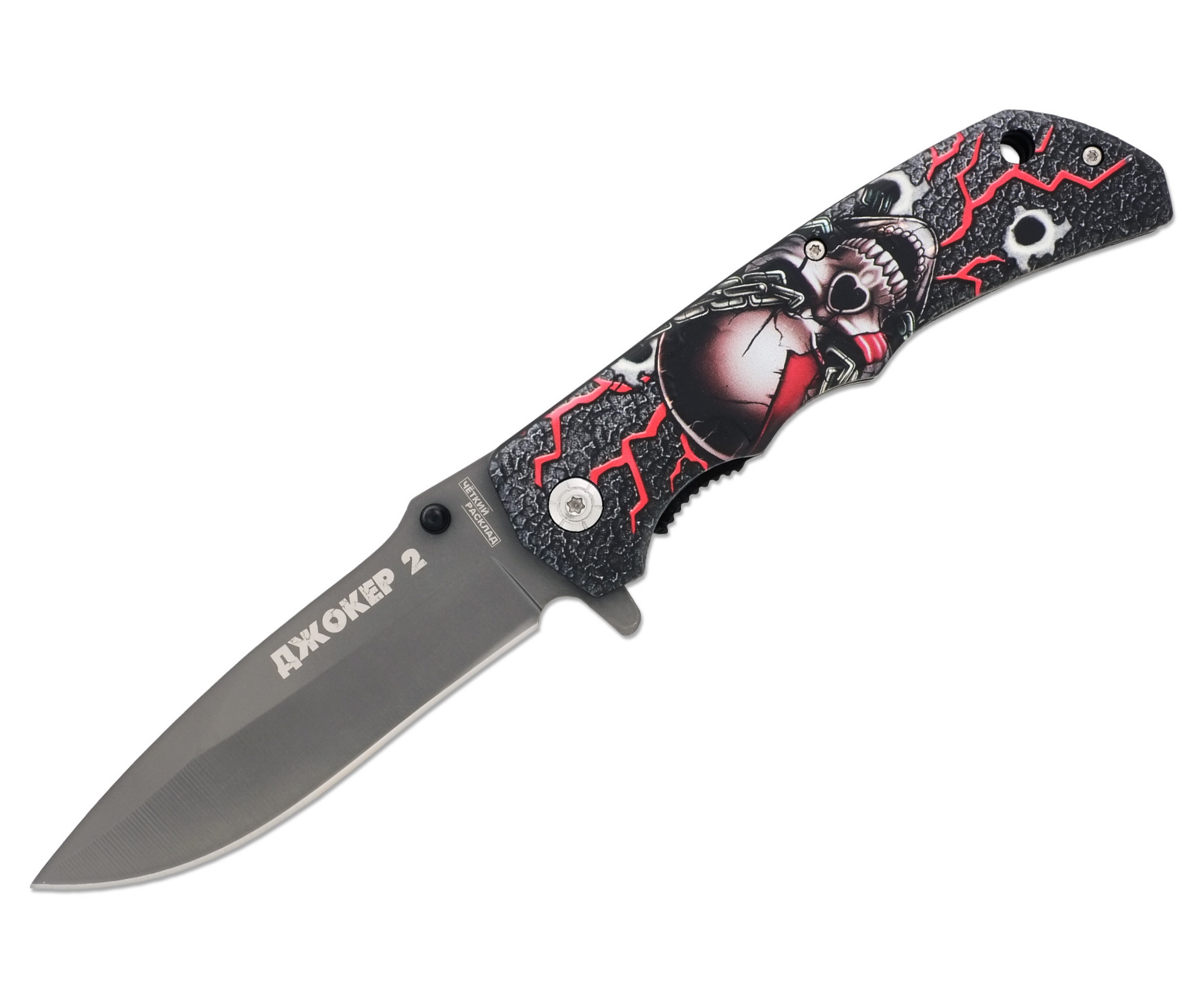 Рукоятка ножа Джокер-2 A-169 металлическая, украшена стилизованным рисунком. Рисунок на поверхность металла нанесен по специальной технологии, обеспечивающей сохранение внешнего вида на длительный период. Механизм открывания ножа – liner lock, для выброса лезвия необходимо нажать на плавник. Навершие инструмента имеет отверстие для установки страховочного шнура.