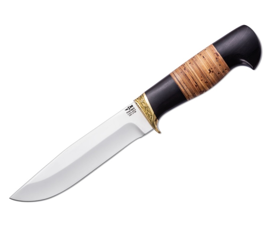 За счет зеркальной полировки клинка изделие получает не только великолепный внешний вид, но и дополнительную защиту от влаги. Изделие имеет очень красивую рукоятку, которая, несомненно, является его украшением. Рукоятка изготовлена из комбинации двух материалов – натуральной древесины граба и бересты, из последнего материала здесь выполнена декоративная вставка на рукоятке. Присутствует гарда, выполняющая функцию упора руки.