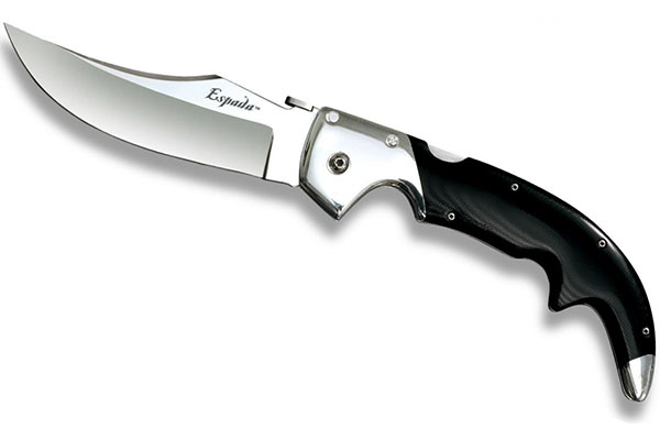 Выпуска Cold Steel Espada осуществляется в трех вариантах размеров. Это сделано для удовлетворения любых категорий пользователей складного изделия. Создавал инструмент талантливейший дизайнер Эндрю Демко, а также Линн С. Томпсон, президент фирмы. К основной задаче относилось создание традиционного типа ножа, имеющего древнюю историю. Они воплотили его в надежнейших материалах, а также в технических решениях для современного конкистадора – человека, имеющего сильных дух и твердую руку. Отмечается немалый размер, есть отличная балансировка и невероятная эргономика. Данные свойства обеспечивают легкие типы режущих, секущих и колющих действий. Клинок бритвенной остроты производится из AUS 8A стали из нержавеющего типа. Во время любого хвата рукояточный изгиб отличается чрезвычайной удобностью, что гарантирует тип максимального комфорта по время использования. G-10 накладки полированного варианта гармонически сочетаются с больстером из алюминия. Espada Large называется карманной саблей.