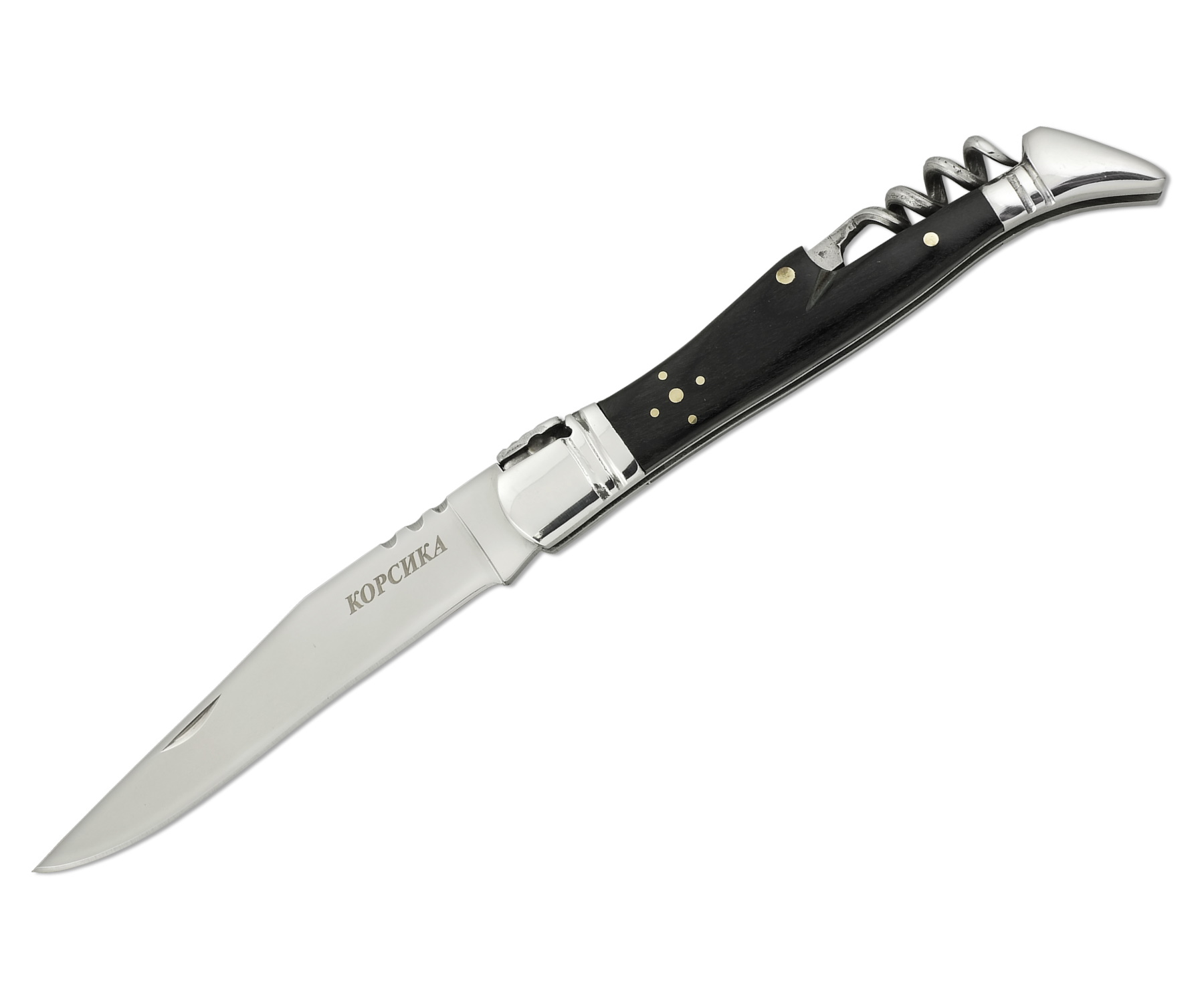 Поверхность лезвия отполирована до зеркального блеска. Дополнительным рабочим инструментом здесь служит штопор для пробок, расположенный сверху рукояти. В этой модели складной механизм фиксируется за счет линейного замка.