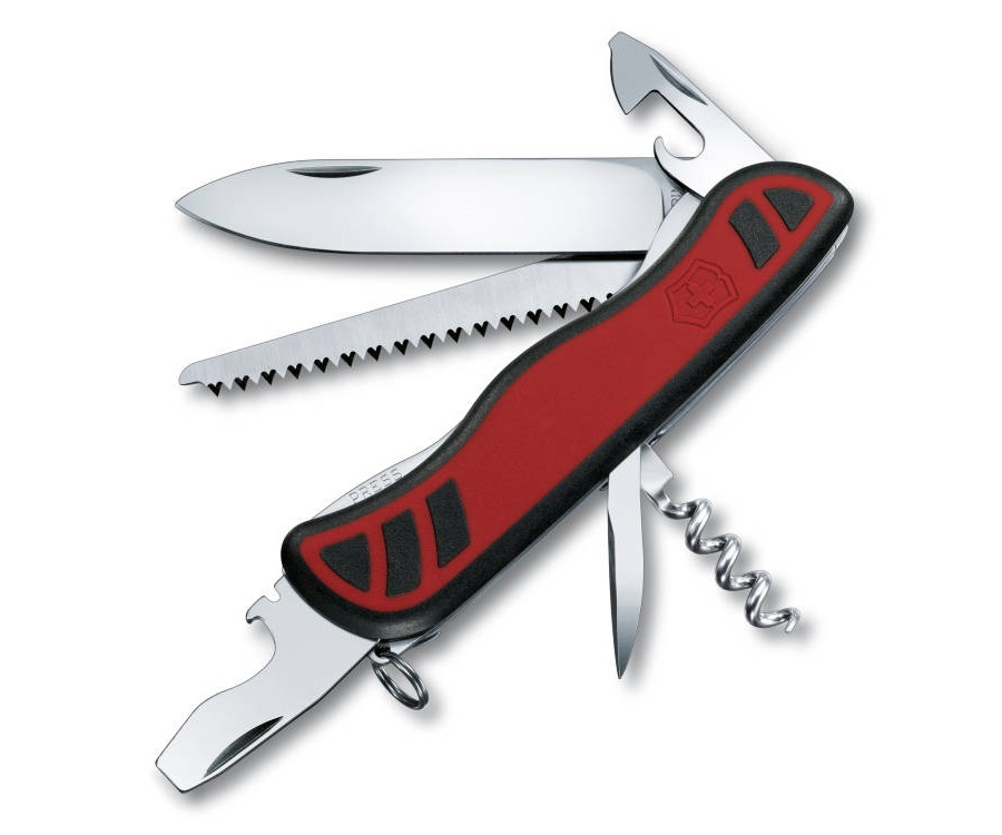 Эта версия имеет 12 различных функций, поэтому способна решать широкие практические задачи, сопровождающие вас в течение дня при помощи большого ножа с плоской заточкой с фиксатором, шила, штопора, пинцета, зубочистки, пилы для работы по дереву, нескольких плоских отверток разного размера, консервного ключа, ключа для открывания бутылок и приспособления для снятия изоляции.