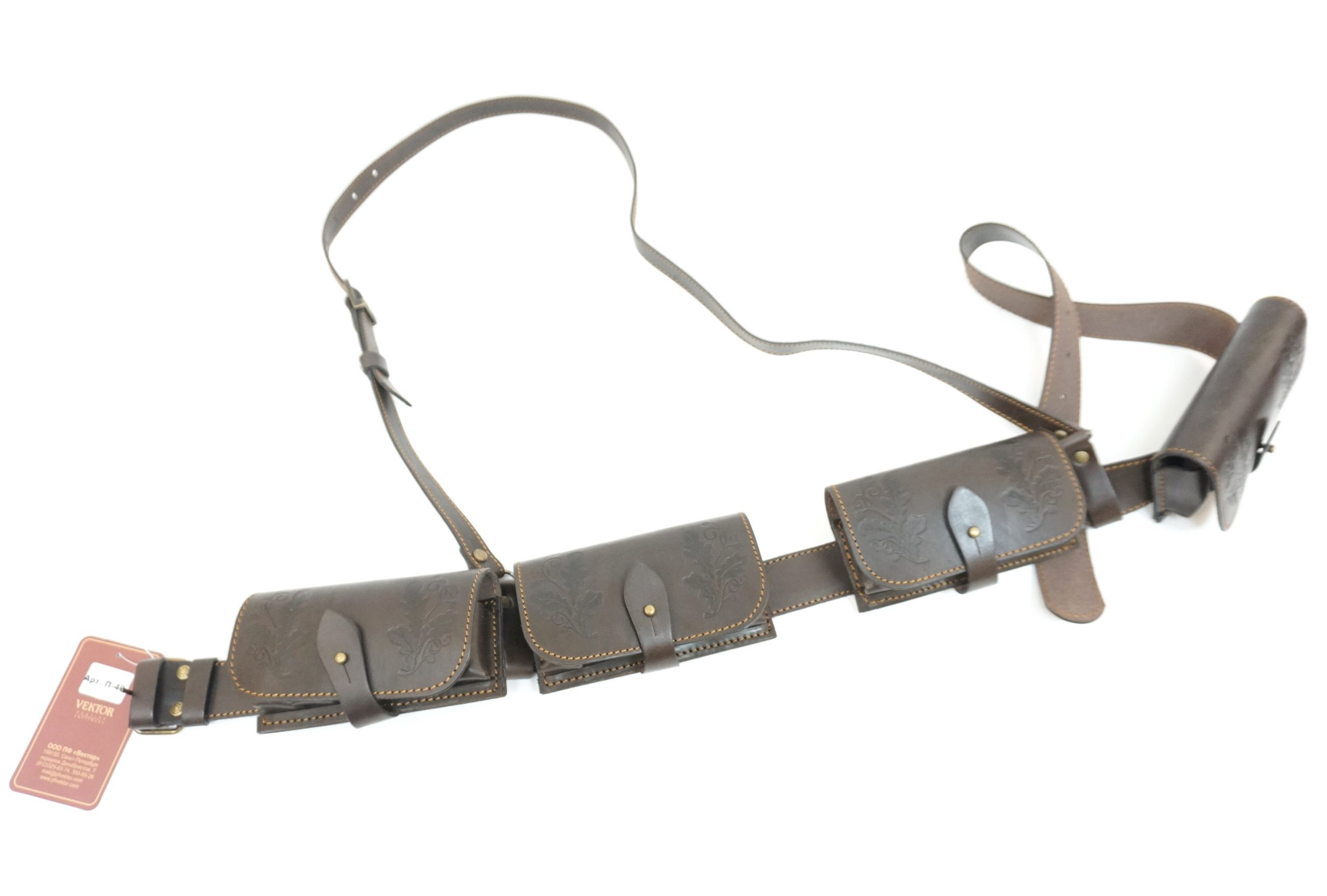 Патронташ из натуральной кожи, со съемными подсумками. Приспособлен для ношения на поясе стрелка, то есть в положении, удобном для быстрого извлечения патронов.Дополнительный поддерживающий плечевой ремень. Длина ремней регулируется металлическими пряжками. Материал ружейного ремнянатуральная кожа.