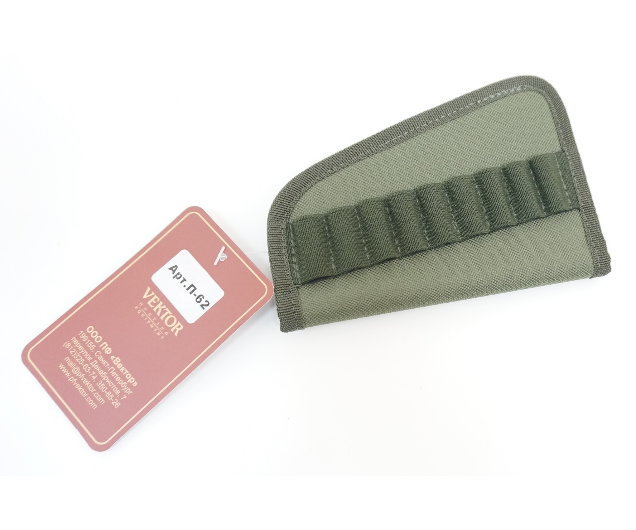 Патронташ Вектор П-62 предназначен для установки на приклад нарезных винтовок и карабинов. Вместимость патронташа — 9 патроновкалибра .223 REM, 7,62х39, 7,62х54R, .308 WIN, .30-06 и другие, с аналогичными габаритами. Фиксация патронов в ячейках патронташа обеспечивается эластичной синтетической лентой и прорезиненной рельефной подложкой.