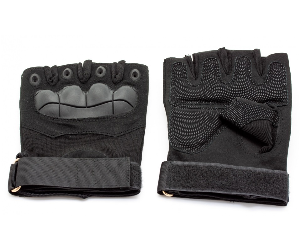 Перчатки тактические Стикхант укороченные черного цвета. Особенности: кастет из усиленного пластика, регулируемые манжеты, антивибрационные демпферы, термостойкий материал, открытые пальцы рук.