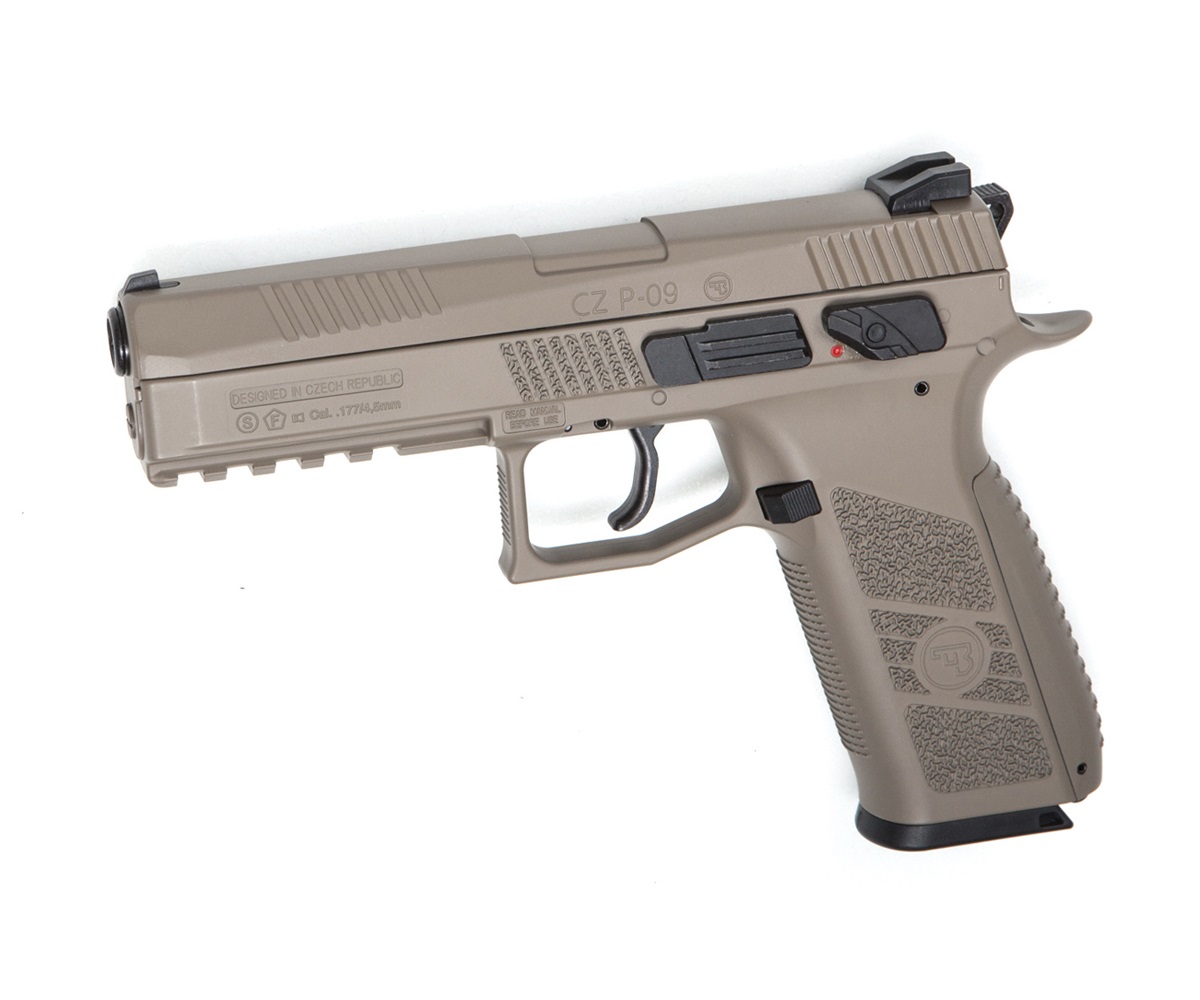 Пистолет ASG CZ P-09 FDE – это газобаллонный прототип боевого пистолета CZ (75) P-09 Duty производства Чехии. Как источник энергии использован баллончик с газом CO2. Для стрельбы можно использовать пули калибра 4,5 мм или шарики ВВ. Модель отличается высокой начальной скоростью пули – до 150 м/с, магазин рассчитан на 16 боеприпасов. Затвор пистолета подвижный, конструкция отличается отсутствием затворной задержки. УСМ у пистолета одинарного действия, стрельба ведется в полуавтоматическом режиме. Хорошую дальность и кучность стрельбы позволяет получить использование нарезкой конструкции ствола. Поскольку дульная энергия находится в пределах 3 Дж, такой пистолет может приобрести каждый желающий.