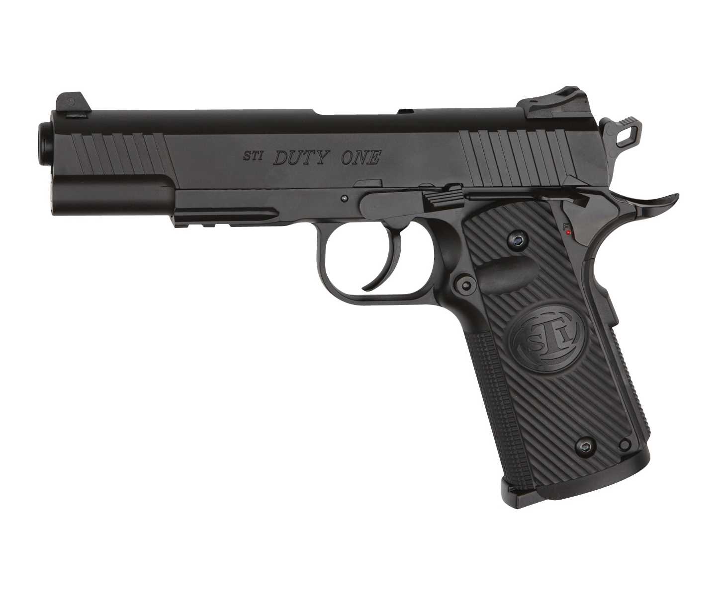 Магазин пистолета ASG STI Duty One вмещает 20 металлических шаров калибром 4,5 мм, стрельба производится с высокой скоростью, прицельная дальность — приблизительно 5-7 метров. У этого пистолета стильный дизайн и хорошая эргономика, а комфортная рукоятка позволяет стрелку совсем не напрягать кисть. Вес модели — 825 грамм.