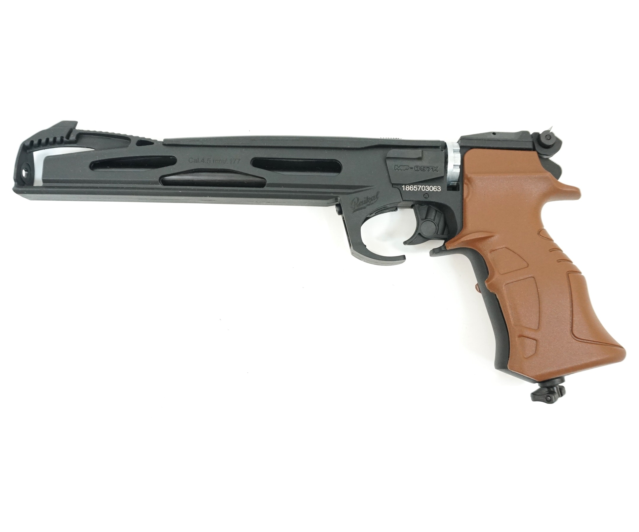 Основные элементы пистолета выполнены из металла, рукоятка оснащена пластиковыми накладками коричневого цвета. Длина пистолета 36 см, вес 0,8 кг. Полная комплектация МР-657К включает уплотнительное кольцо, запорный элемент, кольцо клапана и документы. Упаковка – коробка из картона.