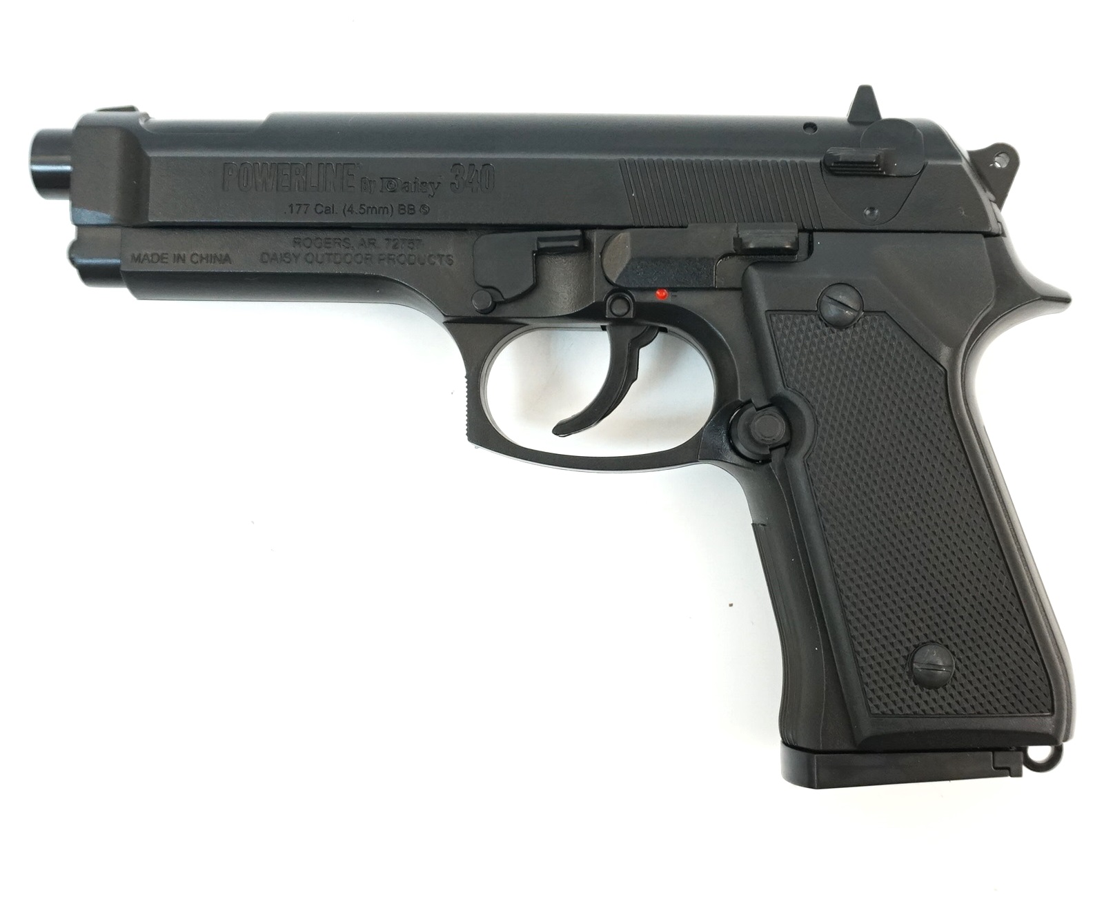 На пятке пистолета имеется антабка для крепления страховочного ремня. Изделие сохранило эргономику и внешний вид своего боевого прототипа. Корпус пистолета выполнен из оружейного пластика, что обеспечивает изделию легкий вес в 0,32 кг, длина пистолета 21,6 см. Целик с мушкой у Daisy Powerline 340 не регулируются. Рифленая накладка на рукоятке повышает удобство удержания оружия. Ствол гладкий, без нарезов внутри. Комплектация: магазин и инструкция, упаковка – блистер.