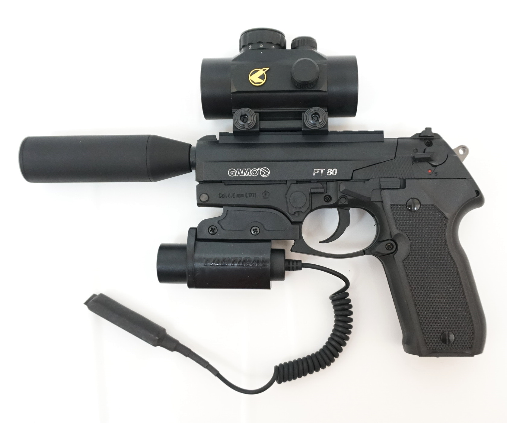 Пневматическая модель пистолета Gamo PT-80 Tactical — превосходная новая версия хорошо себя зарекомендовавшего пистолета Gamo РT-80, представляющая собой пневматическую копию пистолета Беретта 8000. Благодаря наличию системы Gamo Flashlight эта модель позволяет стрелять, почти не целясь. С этим пистолетом можно опустошить 8-зарядный магазин на протяжении 1,6, секунды, при этом 1 баллона с углекислым газом хватает на 80 выстрелов.